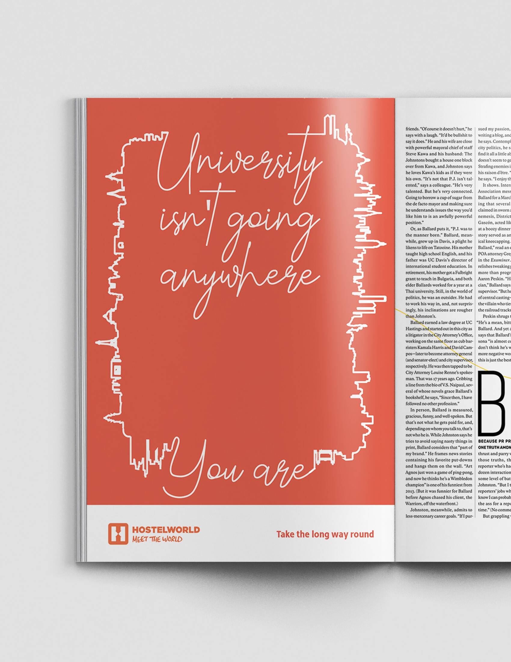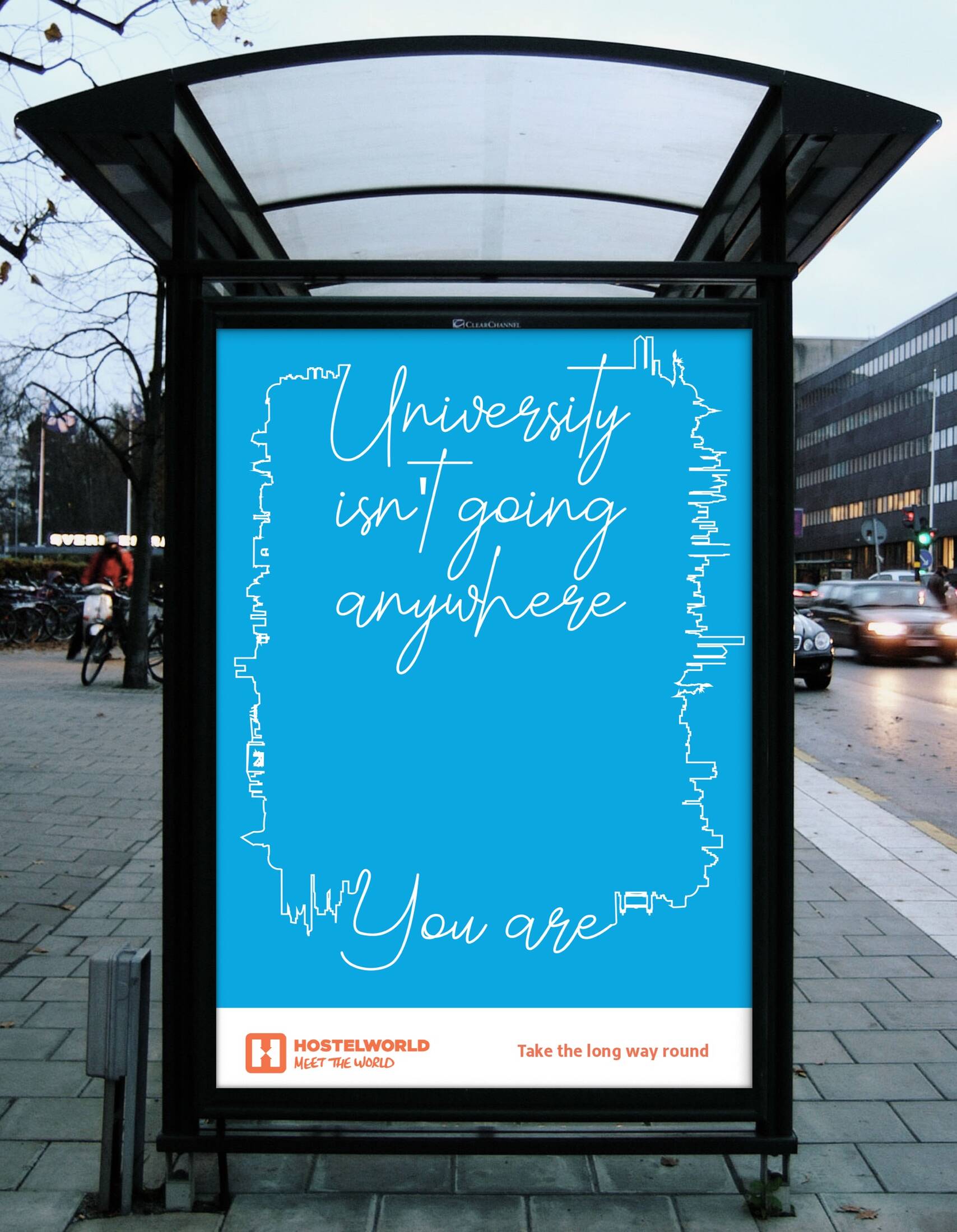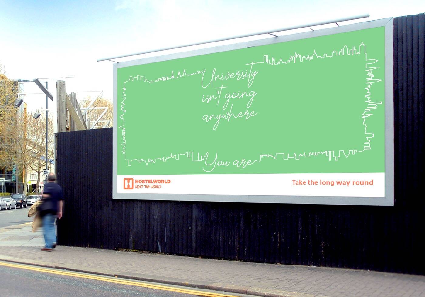 Inspire students to travel, stay in Hostels and book via HostelWorld. The strategy was to encourage students graduating from school to take a year out before going to university. This led me to my big idea 'Take the long way round'. Telling student that universities aren't going anywhere so they can travel the world before they go.