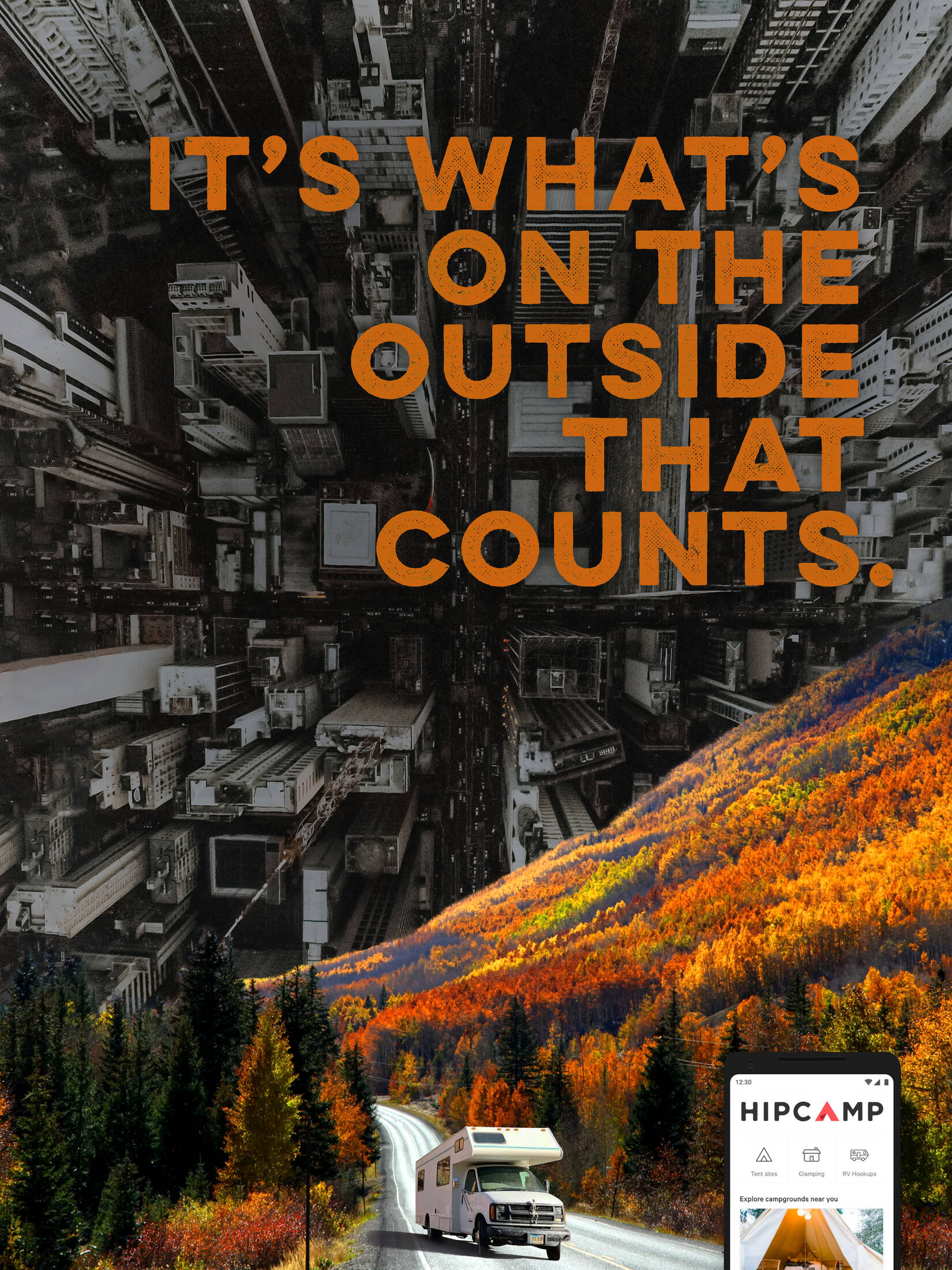 Hipcamp is an app and website that invites people with a love for the outdoors to conveniently discover and book unique camping experiences. This campaign looks to the outdoors as an escape from the chaos of the city and the monotony of the suburbs. The outdoors is where your inner child wants to be, it is the place where we relax and connect with the people we love the most. So take that child outside and enter the world of Hipcamp.