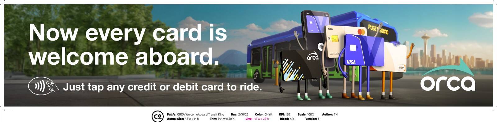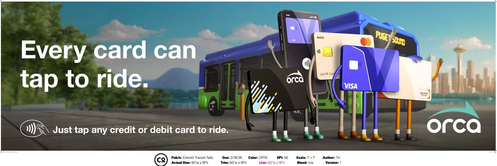 The campaign introduces its brand new feature: tap-to-pay. Now, commuters across King, Kitsap, Pierce, and Snohomish counties can board Community Transit, Everett Transit, Kitsap Transit, King County Metro, Pierce Transit, and Sound Transit using any credit or debit card, with no ORCA card required.