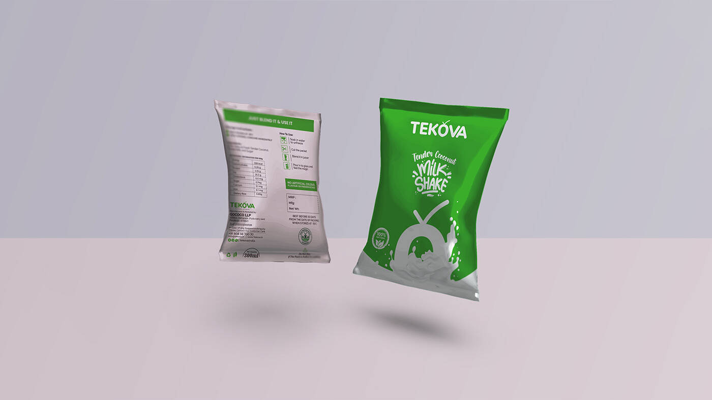 For Tekova, a brand dedicated to providing refreshing and natural beverages, I created an eye-catching package design for their Tender Coconut Milkshake. The design features a vibrant green color palette that evokes freshness and aligns with the natural essence of the product. The playful typography and clean graphics convey the fun and creamy experience of the milkshake. A prominent coconut illustration paired with splashes of milk visually represents the product, making it easily recognizable and appealing on the shelf.
