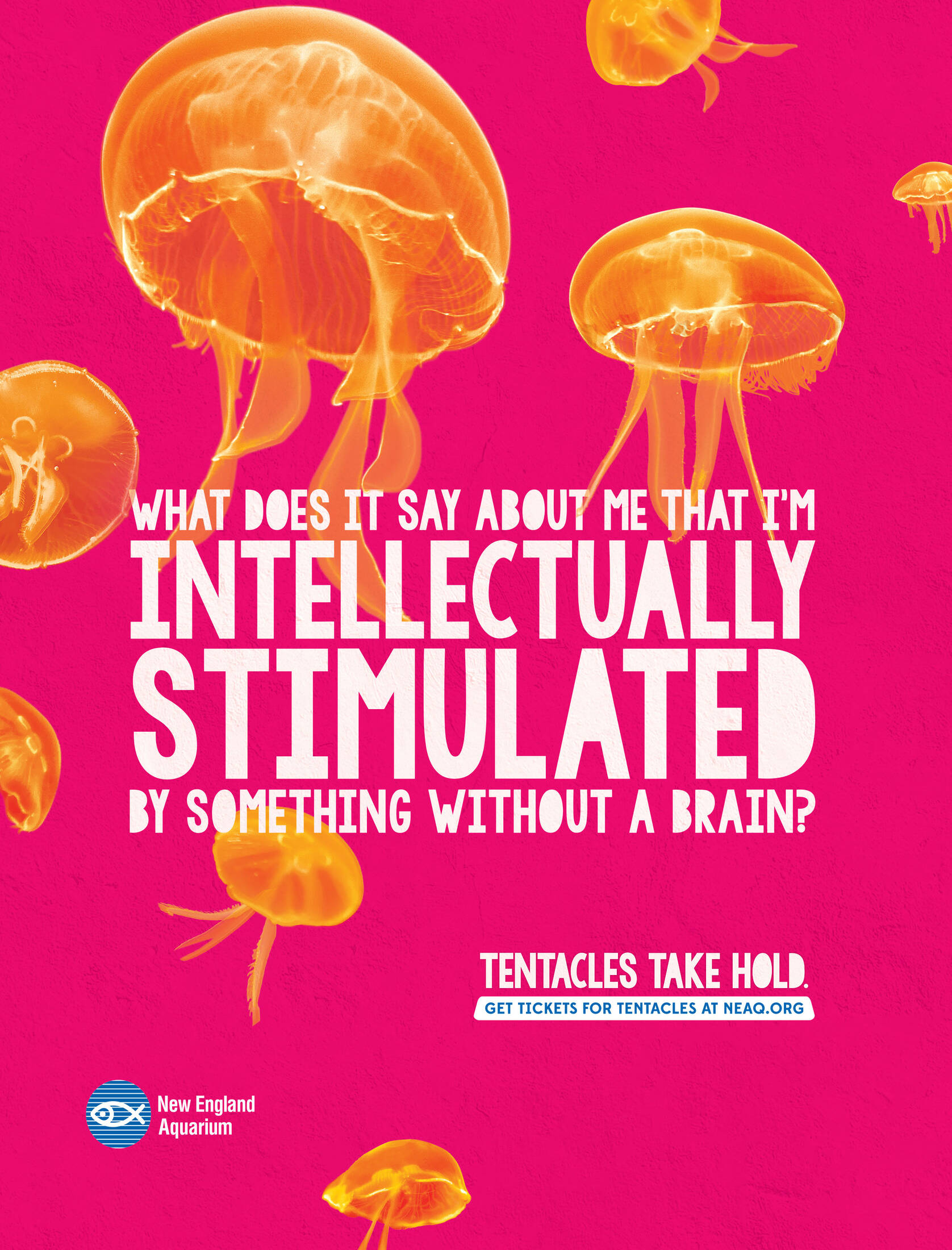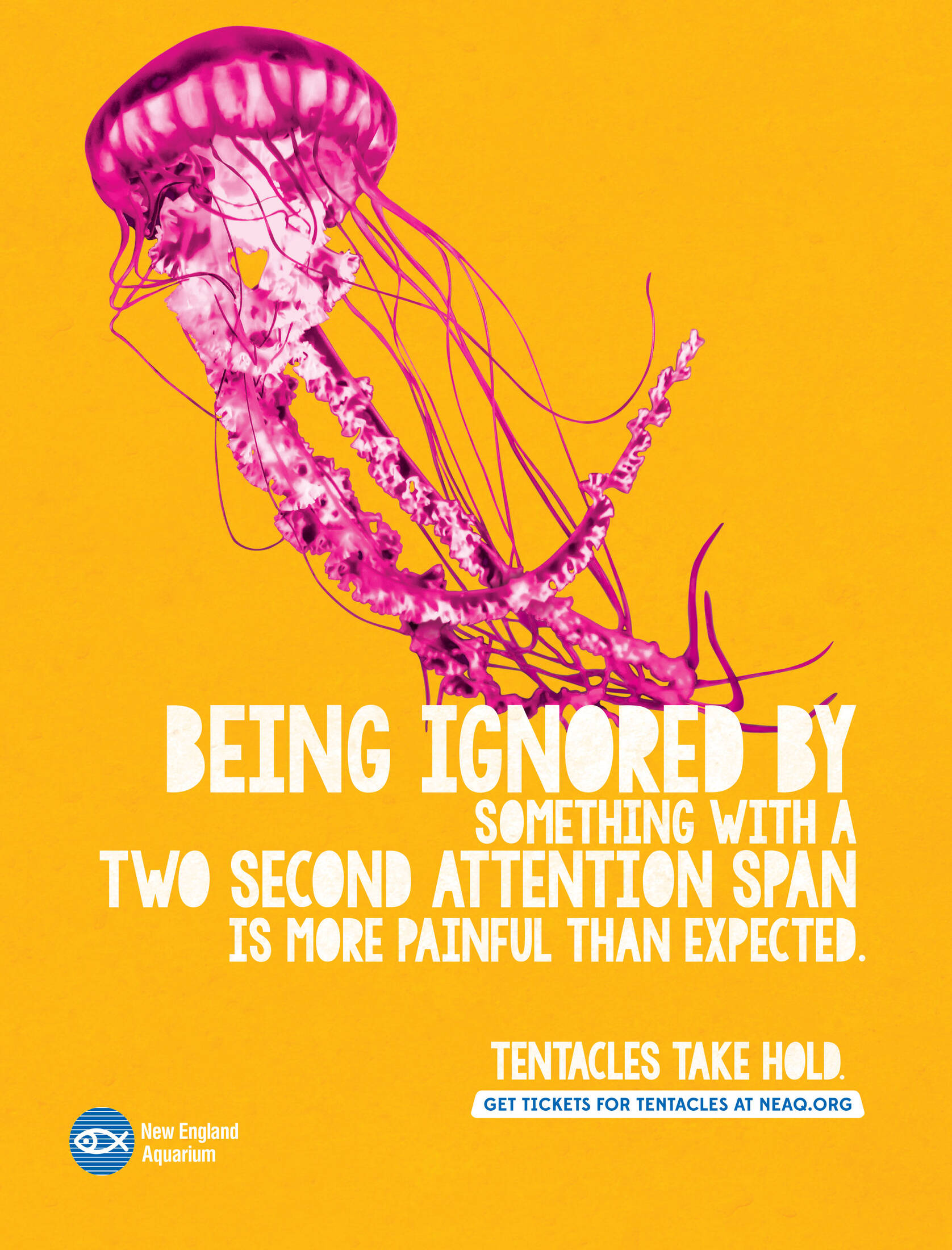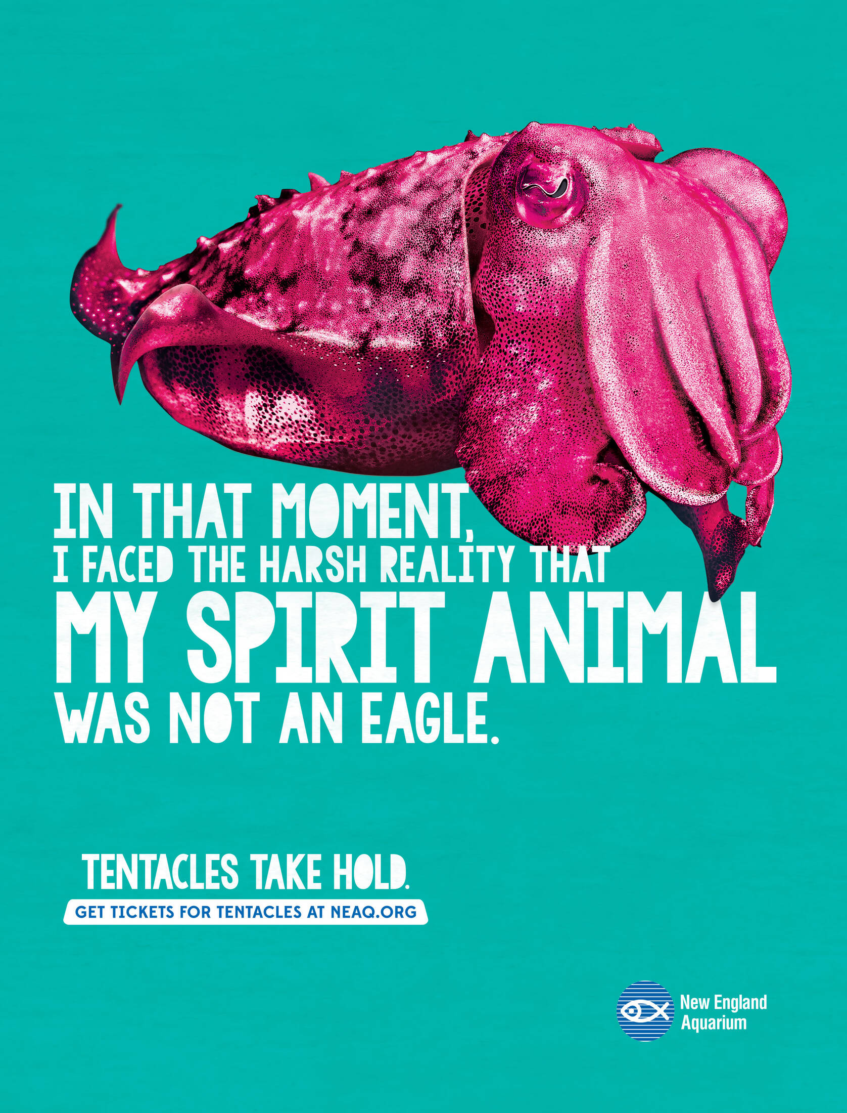 This professional campaign titled 'Tentacles take hold' was published in United States in June, 2016. It was created for the brand: New England Aquarium, by ad agency: Connelly Partners. This Print medium campaign is related to the Recreation, Leisure industry and contains 3 media assets. It was submitted almost 9 years ago.