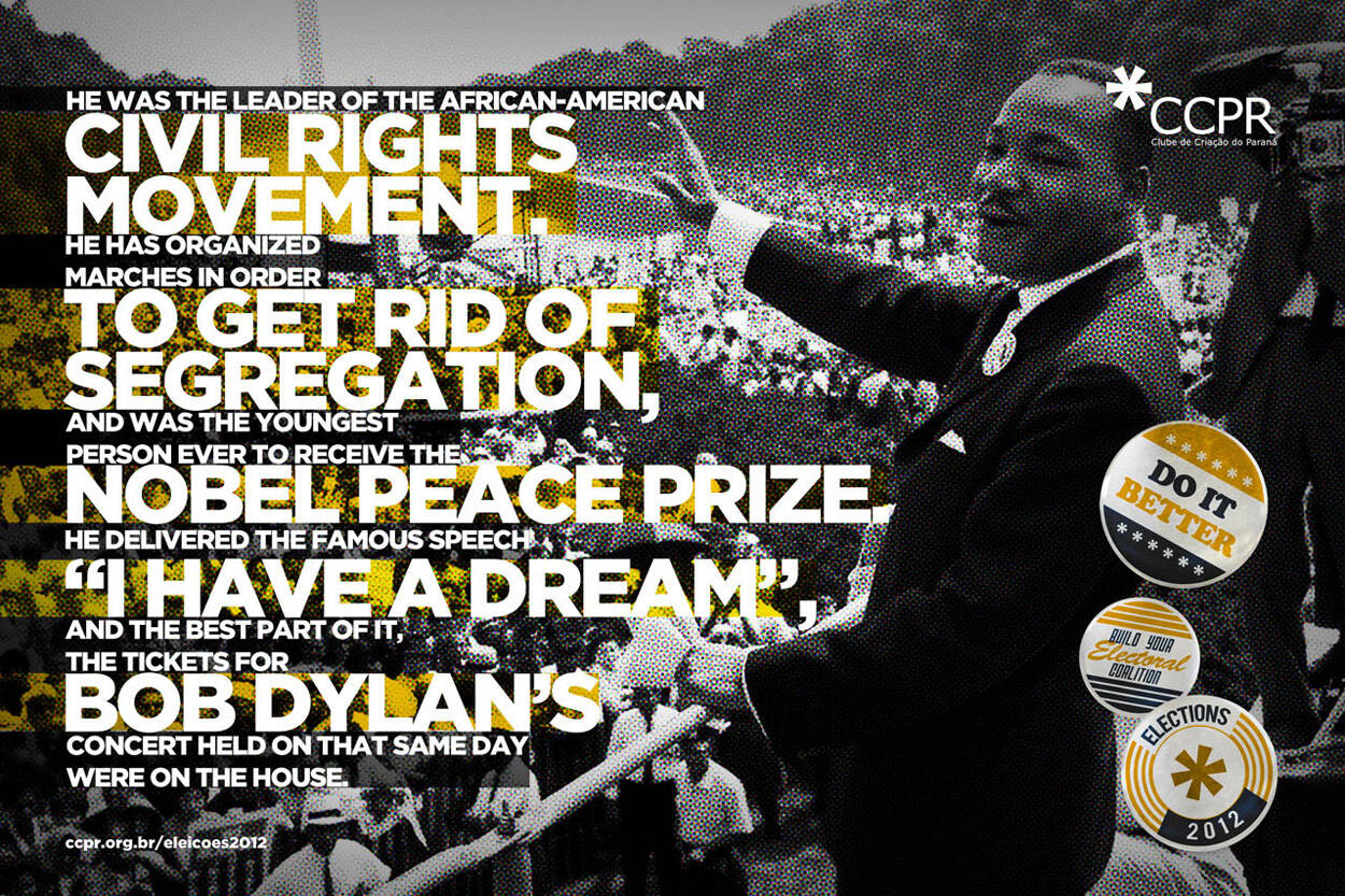 This professional campaign titled 'Thatcher, Lula, King, Clinton' was published in Brazil in January, 2013. It was created for the brand: CCPR, by ad agency: Blu. This Print medium campaign is related to the Public Interest industry and contains 4 media assets. It was submitted almost 13 years ago.