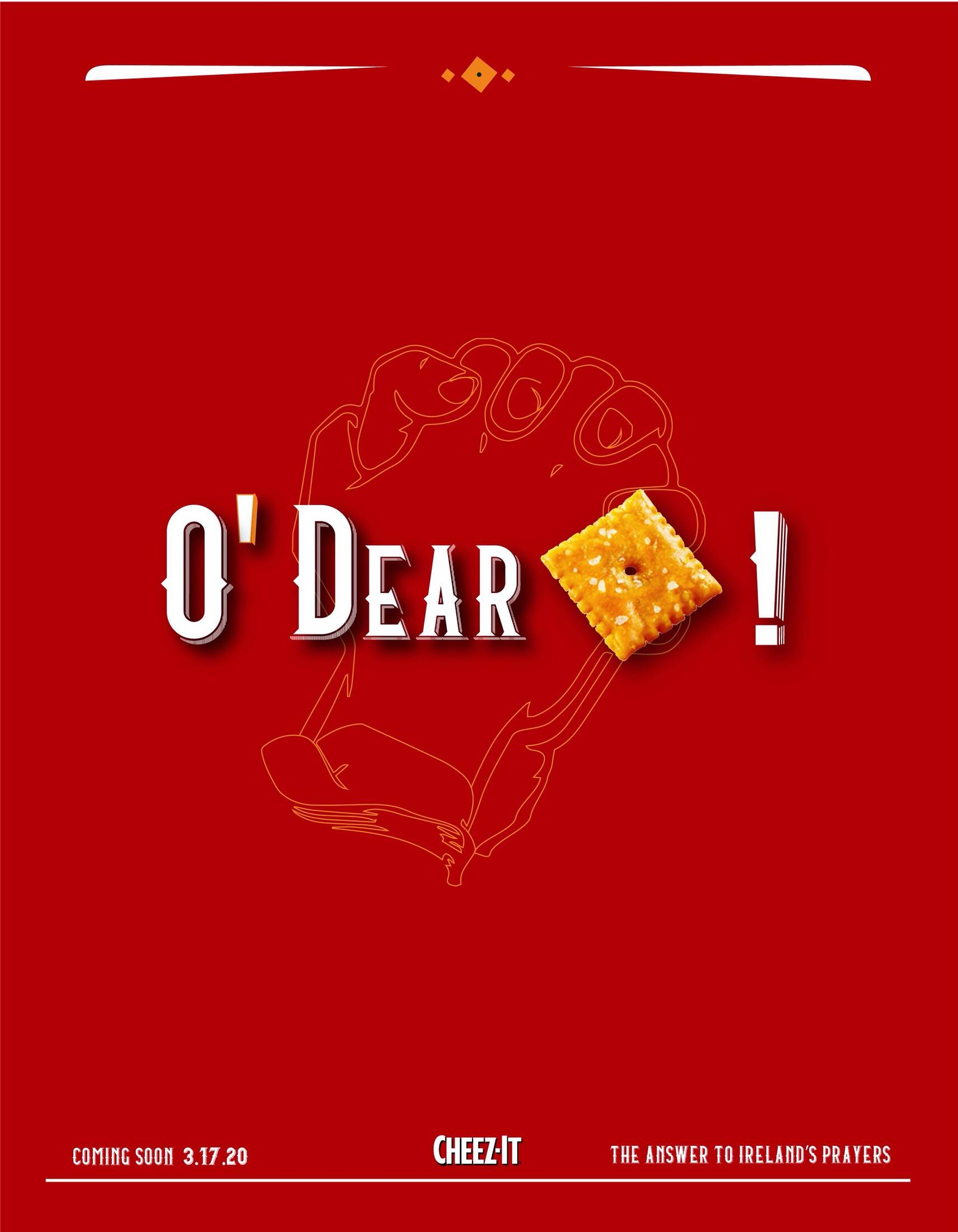 This student campaign titled 'The Answer to Ireland's Prayers' was published in United States in May, 2019. It was created for the brand: Cheez-It, by ad school: The Creative Circus. This Integrated medium campaign is related to the Confectionery, Snacks industry and contains 7 media assets. It was submitted almost 6 years ago by Art Director: Morgan DeBrincat.
