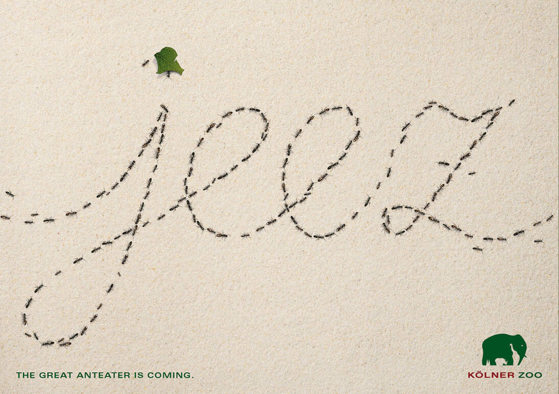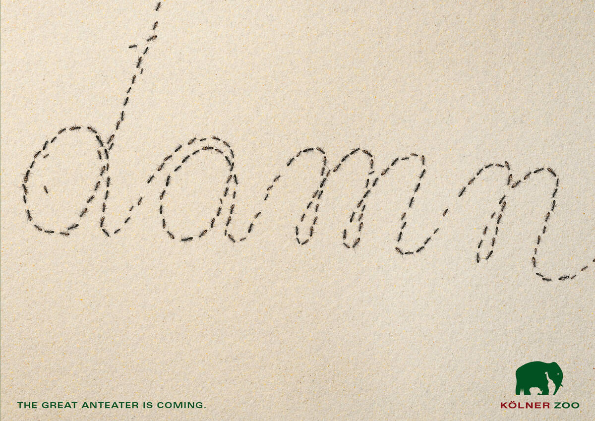 This professional campaign titled 'The Anti-Anteater Font, Jeez, The Anti-Anteater Font, Cra...' was published in Germany in February, 2012. It was created for the brand: Zoo Cologne, by ad agency: Preuss und Preuss. This Print medium campaign is related to the Recreation, Leisure industry and contains 3 media assets. It was submitted almost 14 years ago.