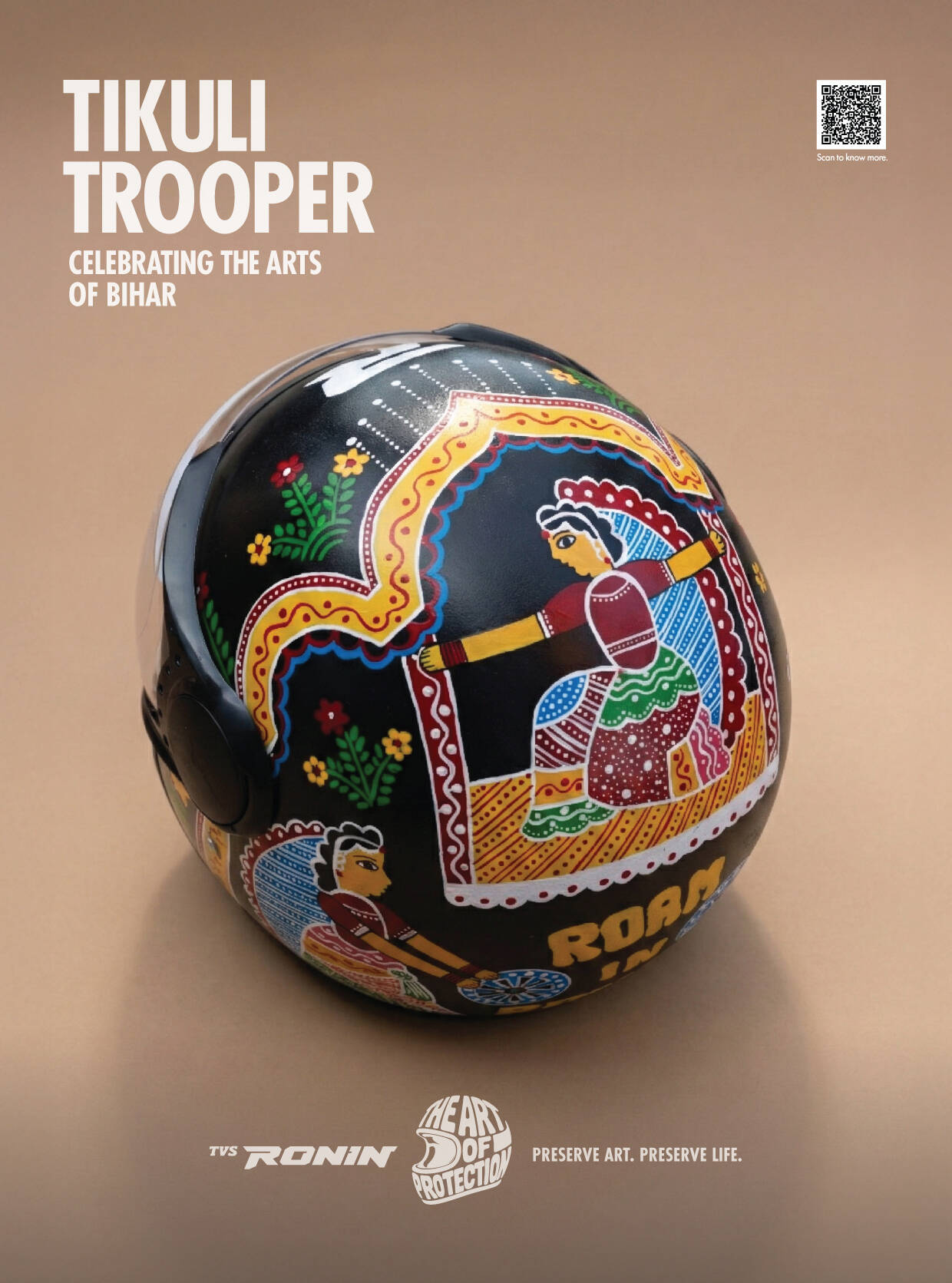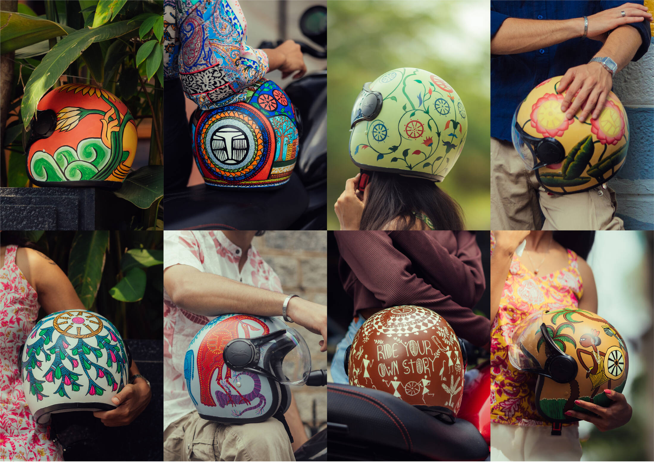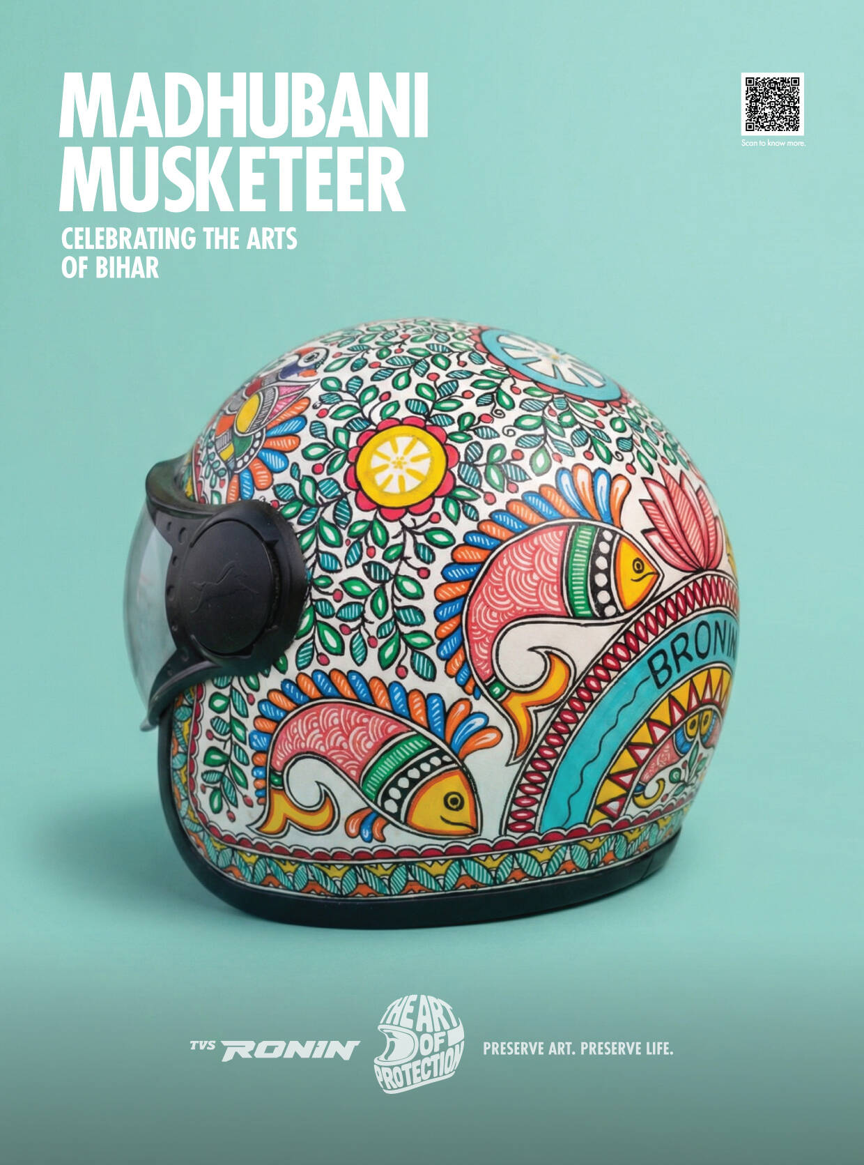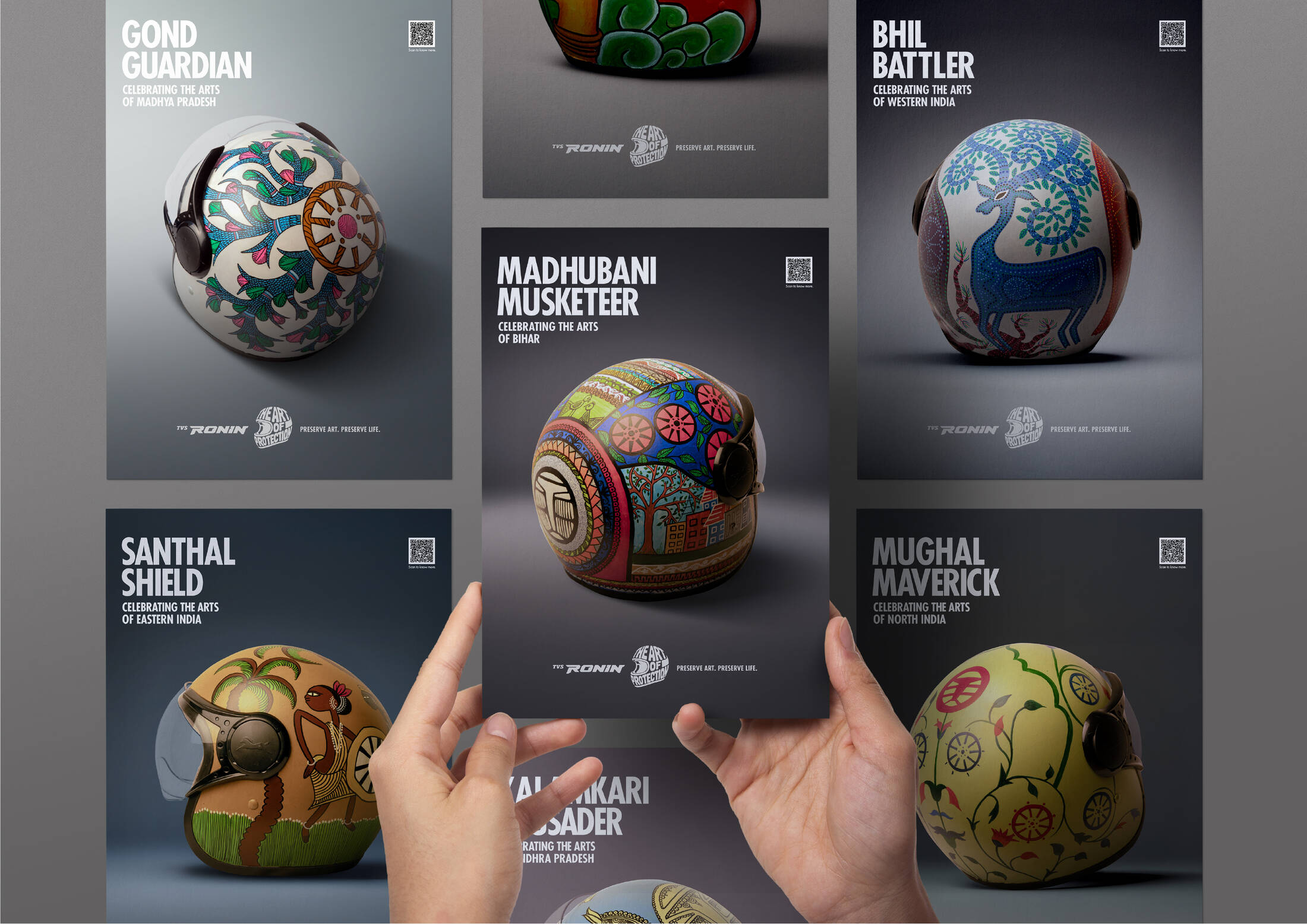TVS RONIN’s The Art of Protection features a limited-edition collection of hand-painted helmets that fuse safety with storytelling. Each helmet is a wearable tribute to dying Indian folk arts, created in collaboration with homegrown artists. The design language, across over 380 hand-painted helmets, blends motorcycling elements with traditional folk art palettes and patterns. Since inception, the campaign has featured capsule launches, displays, workshops, collaborations, and on-ground installations that leverage vibrant design to promote both protection and preservation.
