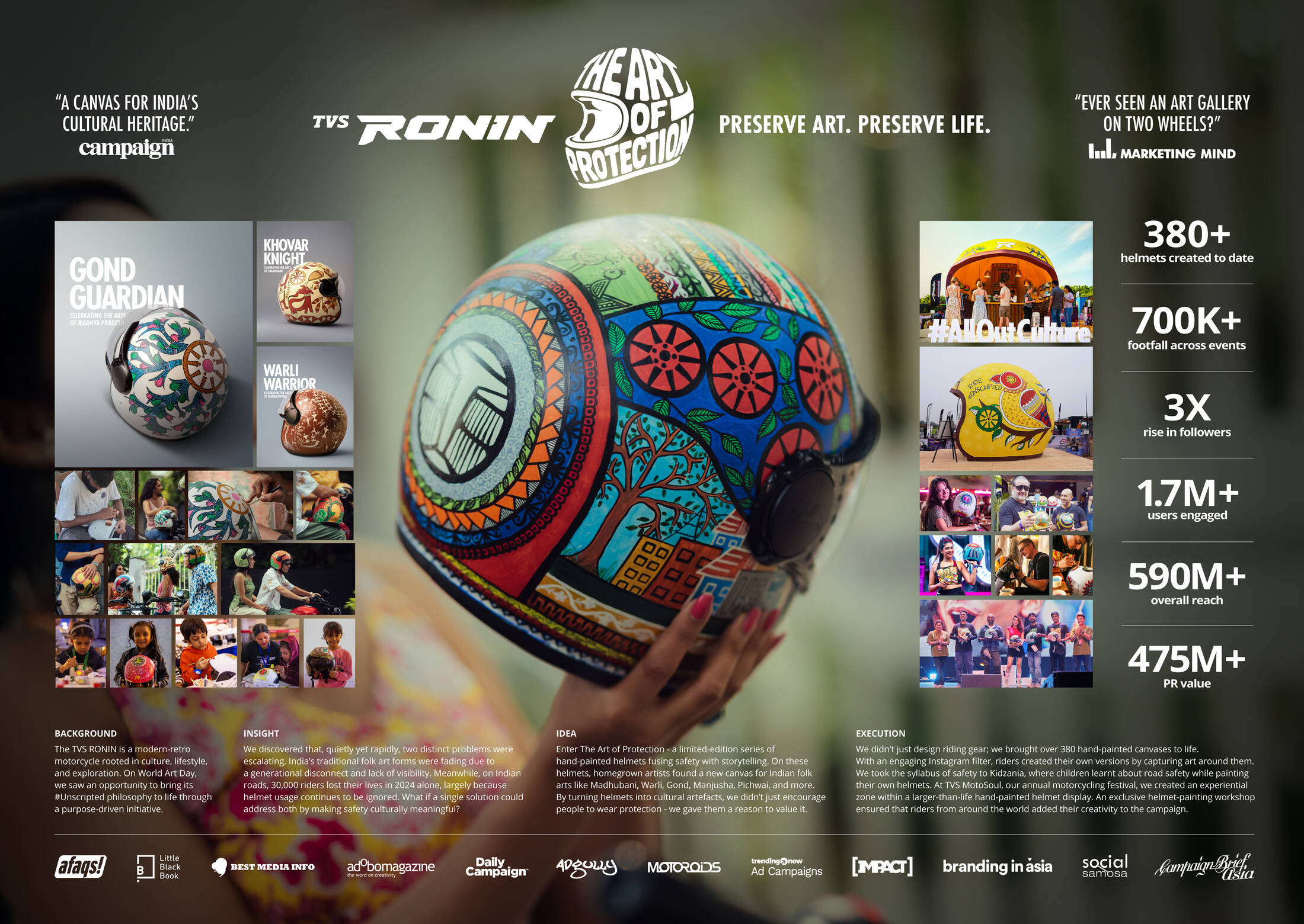 This professional campaign titled 'The Art of Protection' was published in India in December, 2025. It was created for the brand: TVS Ronin, by ad agency: TBWA\ India. This Design, Experiential, and Integrated media campaign is related to the Automotive and Personal Transportation and Public Interest industries and contains 25 media assets. It was submitted 16 days ago.