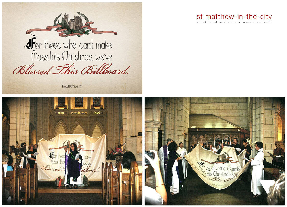Couldn't make it to church on Christmas? That's OK. You still have a shot at absolution - if you live in Auckland, New Zealand. St. Matthew in the City, a progressive Anglican church famous for its ad stunts, blessed a TBWA Tequila billboard during services the previous Sunday. It's been up outside the church ever since, offering locals a drive-by blessing. If you happen to be walking by, you're encouraged to touch the ad, for extra blessedness.