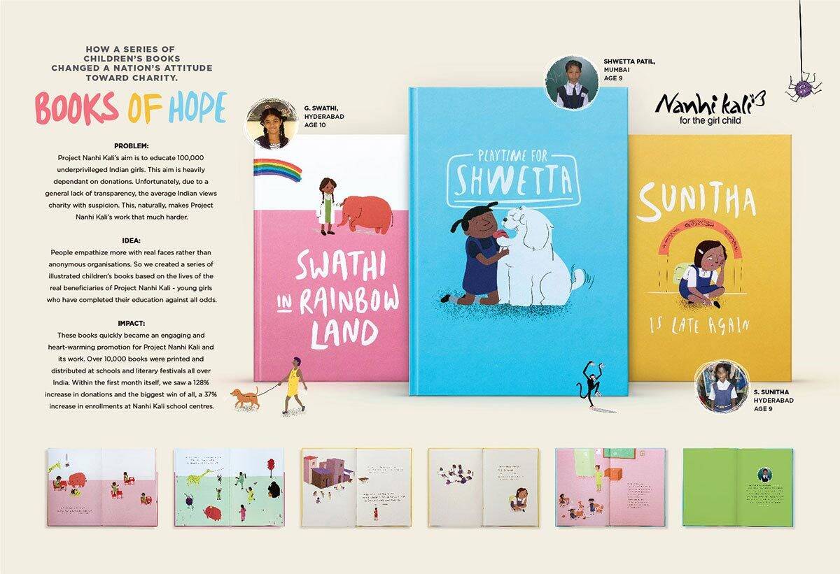 Most Indians view charity with suspicion.The reason for not donating is the same: “I don’t know where my money goes.” Of course, this doesn’t make life easy for legitimate organizations like Project Nanhi Kali, for instance. A girl child education initiative, Project Nanhi Kali is committed to educating 100,000 underprivileged girls in India. So our idea came from a simple truth: people are more willing to donate when they empathize with a cause and understand exactly who it is their money is helping. So we decided to give potential donors something that engages them in an individual’s story, rather than asks for donations to a faceless cause. The answer was a series of beautifully illustrated children’s books inspired by real stories of girls Project Nanhi Kali had helped. Each book told the real story of a girl’s every day struggle to get educated in a voice that was simple and easily understood.