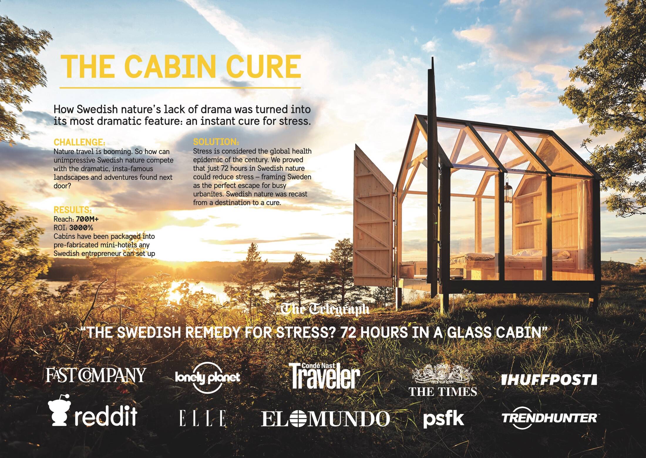 This professional campaign titled 'The Cabin Cure' was published in Sweden in September, 2017. It was created for the brand: Visit Sweden, by ad agency: Weber Shandwick. This Ambient medium campaign is related to the Hospitality, Tourism industry and contains 6 media assets. It was submitted about 7 years ago.