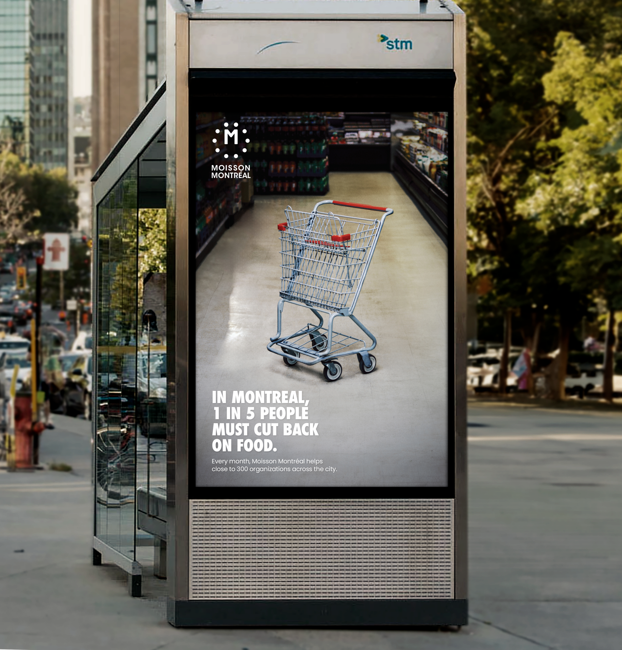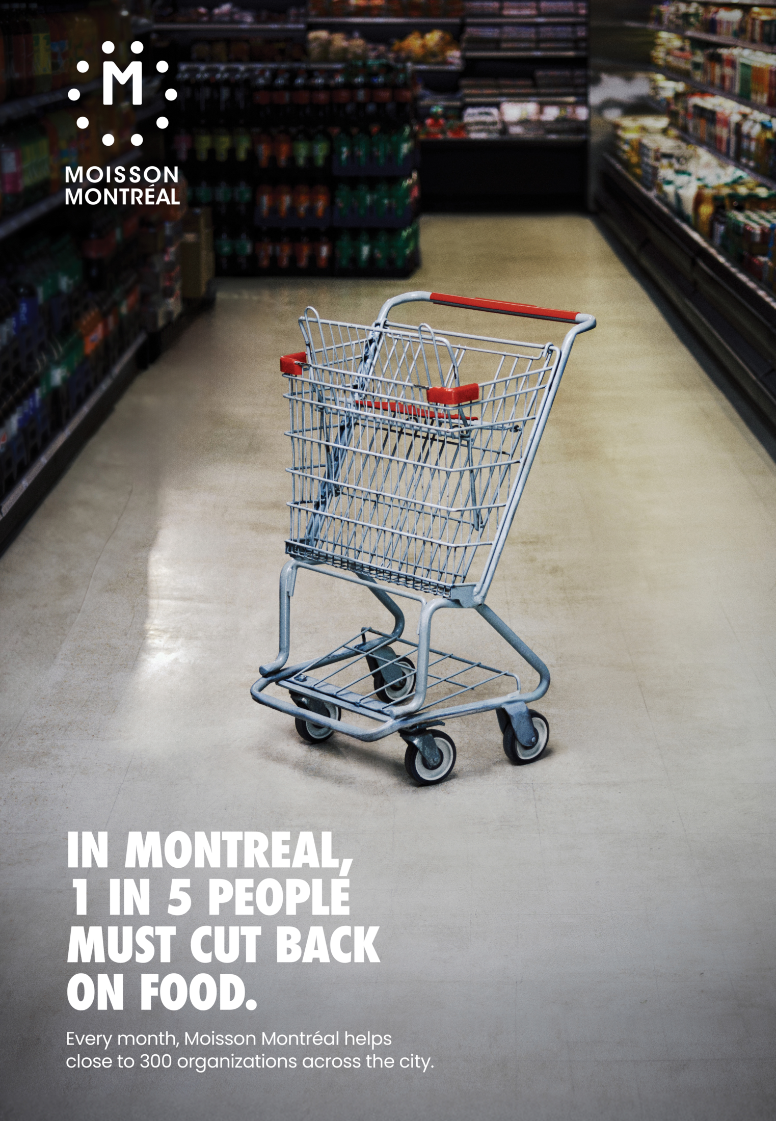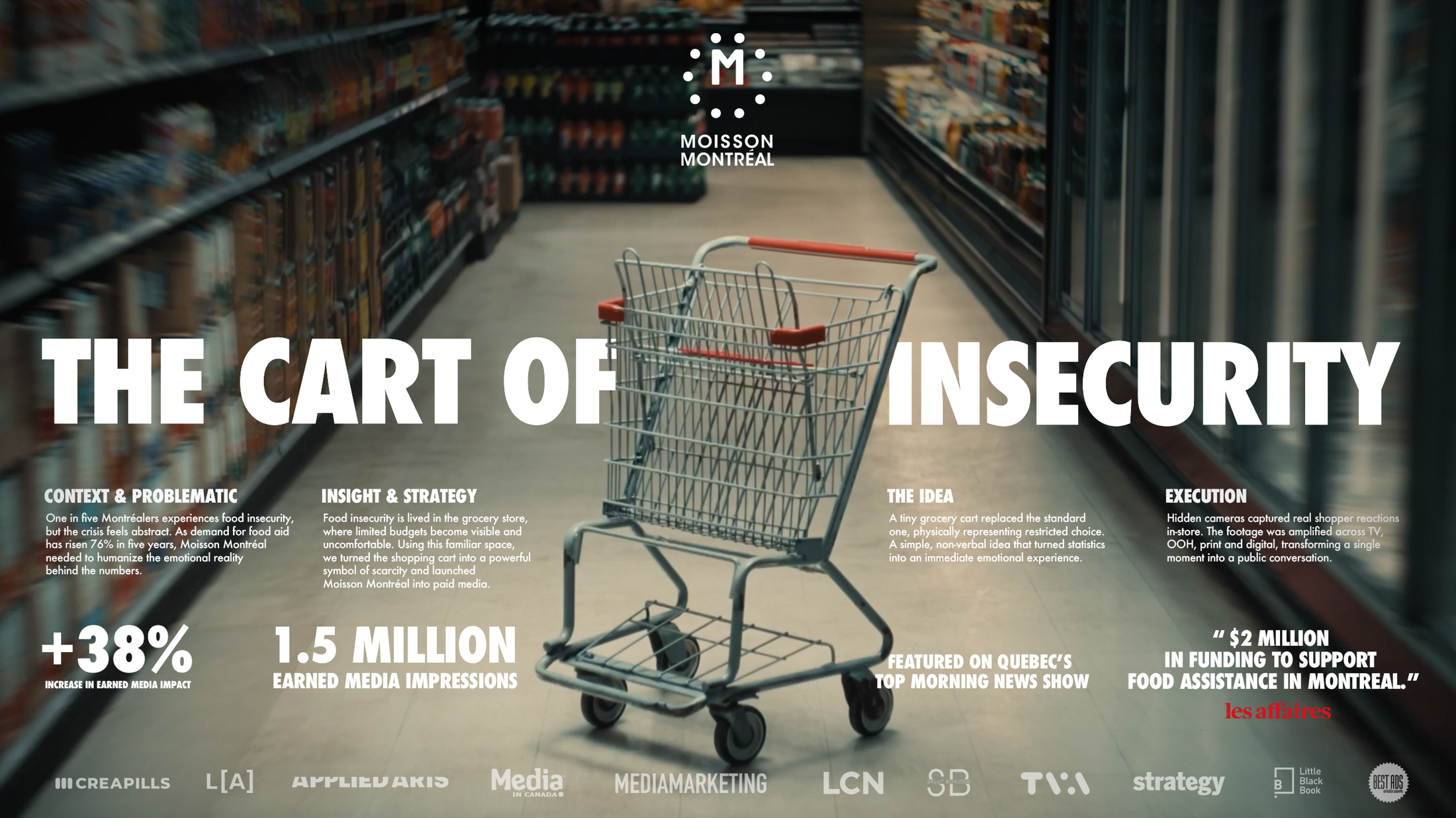 This professional campaign titled 'The Cart of Insecurity' was published in Canada in May, 2025. It was created for the brand: Moisson Montréal, . This Ambient, Film, and Print media campaign is related to the Food, Health, and Public Interest industries and contains 4 media assets. It was submitted about 3 hours ago by Art Director: Patrick Rochon of LG2.