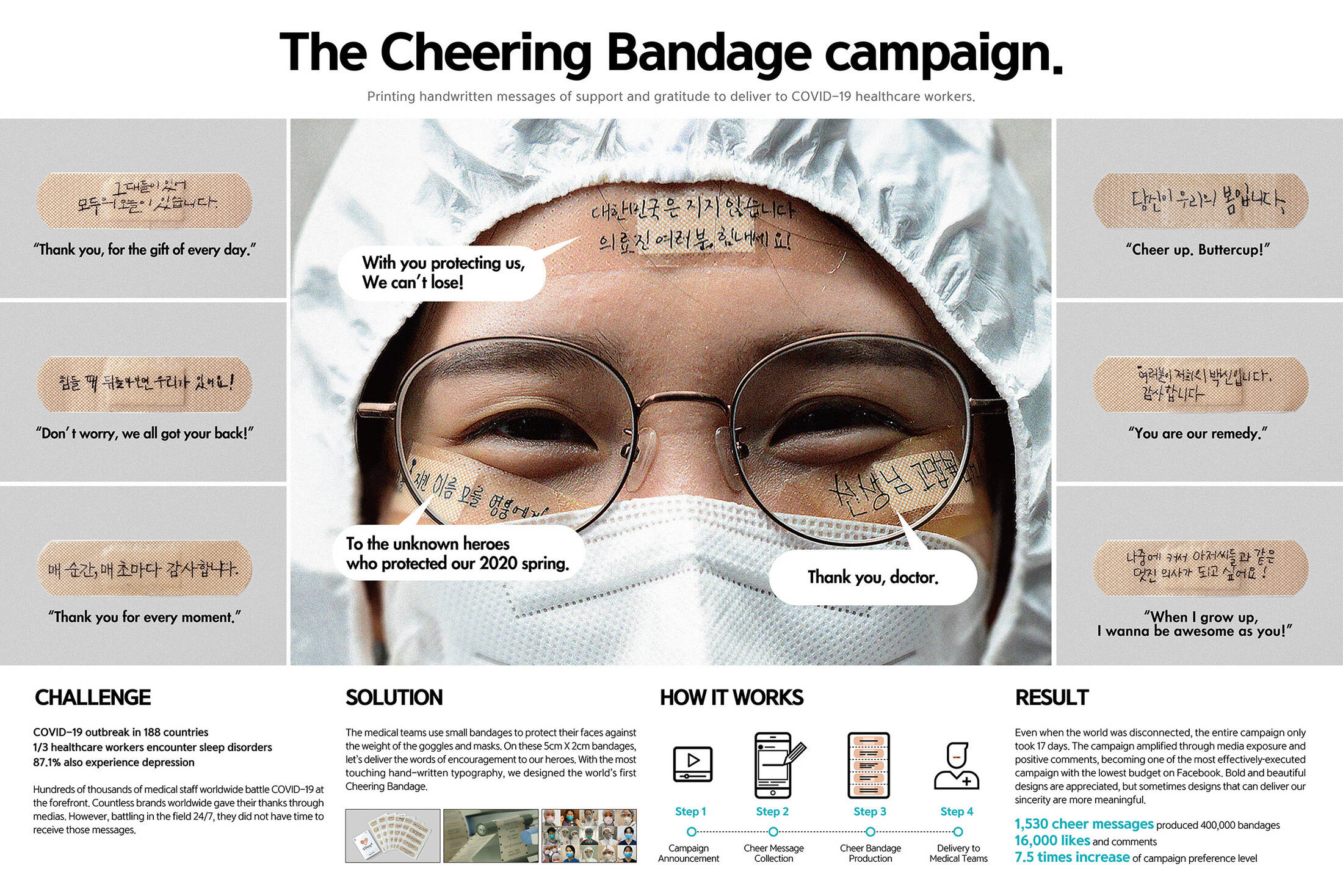 This professional campaign titled 'The Cheering Bandage' was published in South Korea in April, 2020. It was created for the brand: Facebook, by ad agency: Innocean. This Experiential medium campaign is related to the Health, Professional Services, and Public Interest industries and contains 2 media assets. It was submitted almost 5 years ago by GL3: Kiwoon Kim of INNOCEAN WORLDWIDE.