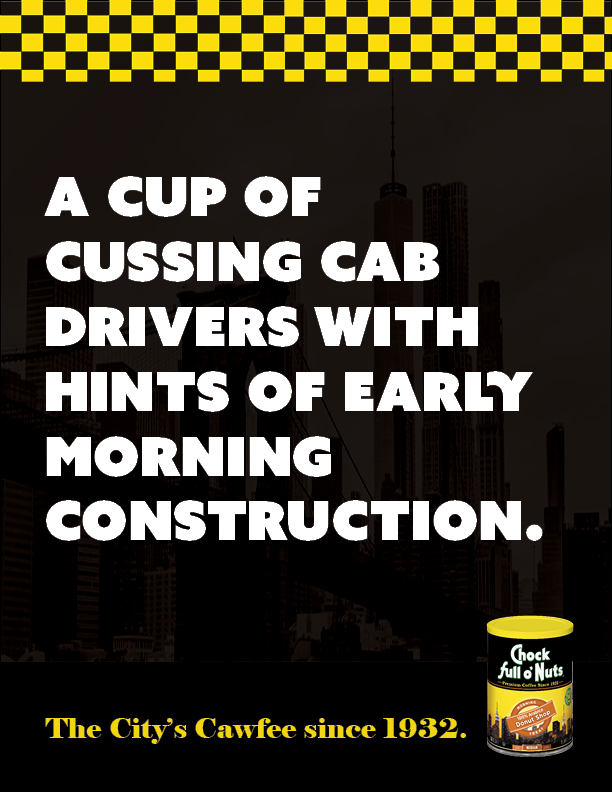 Print 2: "A cup of cussing cab drivers with hints of early morning construction."