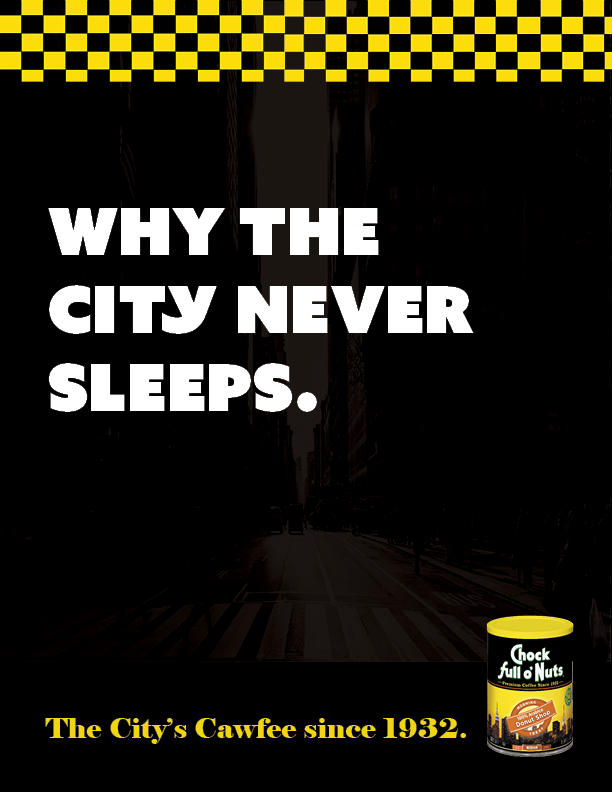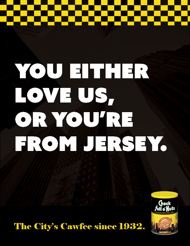 A campaign that establishes a distinct brand voice for Chock full o' Nuts, positioning it as a coffee brand that identifies exclusively with the New York Metropolitan Area and its culture.