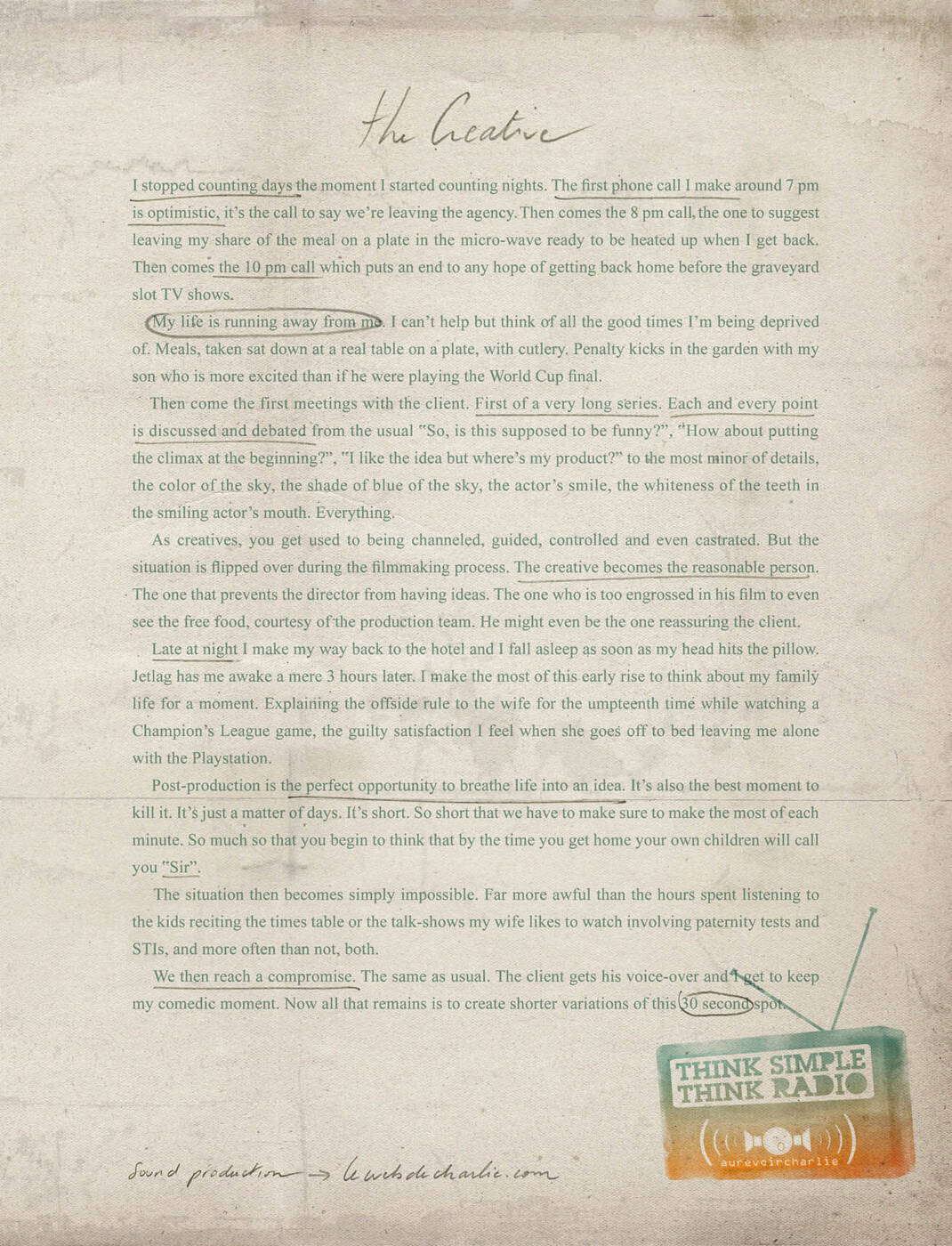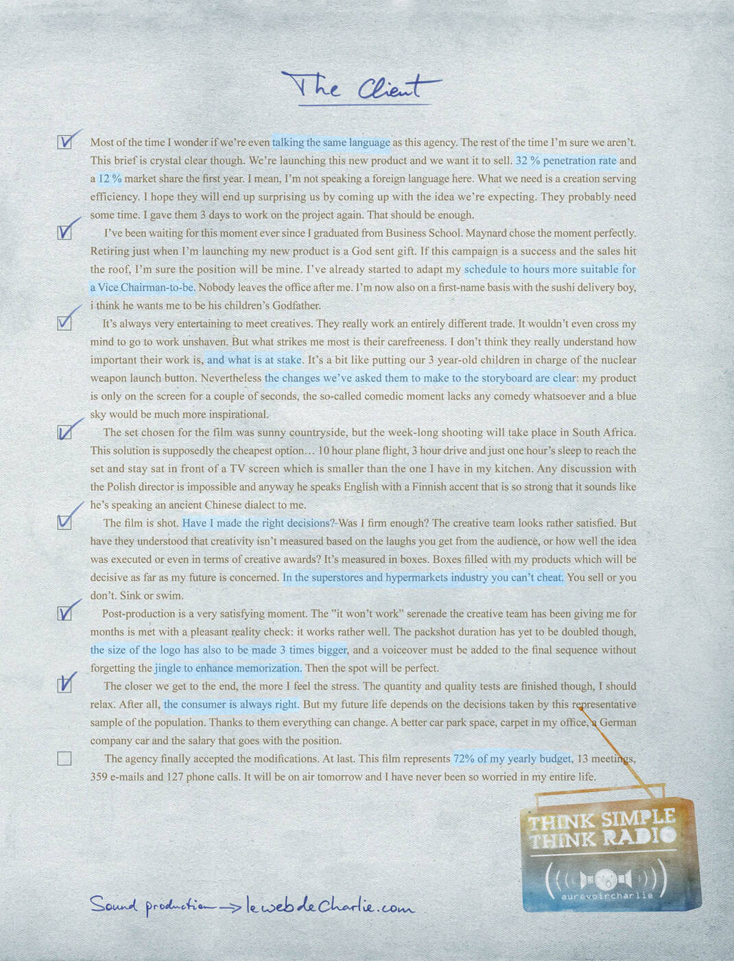 This professional campaign titled 'The Client, The Creative' was published in France in October, 2009. It was created for the brand: Au Revoir Charlie, by ad agency: FCB. This Print medium campaign is related to the Professional Services industry and contains 2 media assets. It was submitted about 16 years ago.