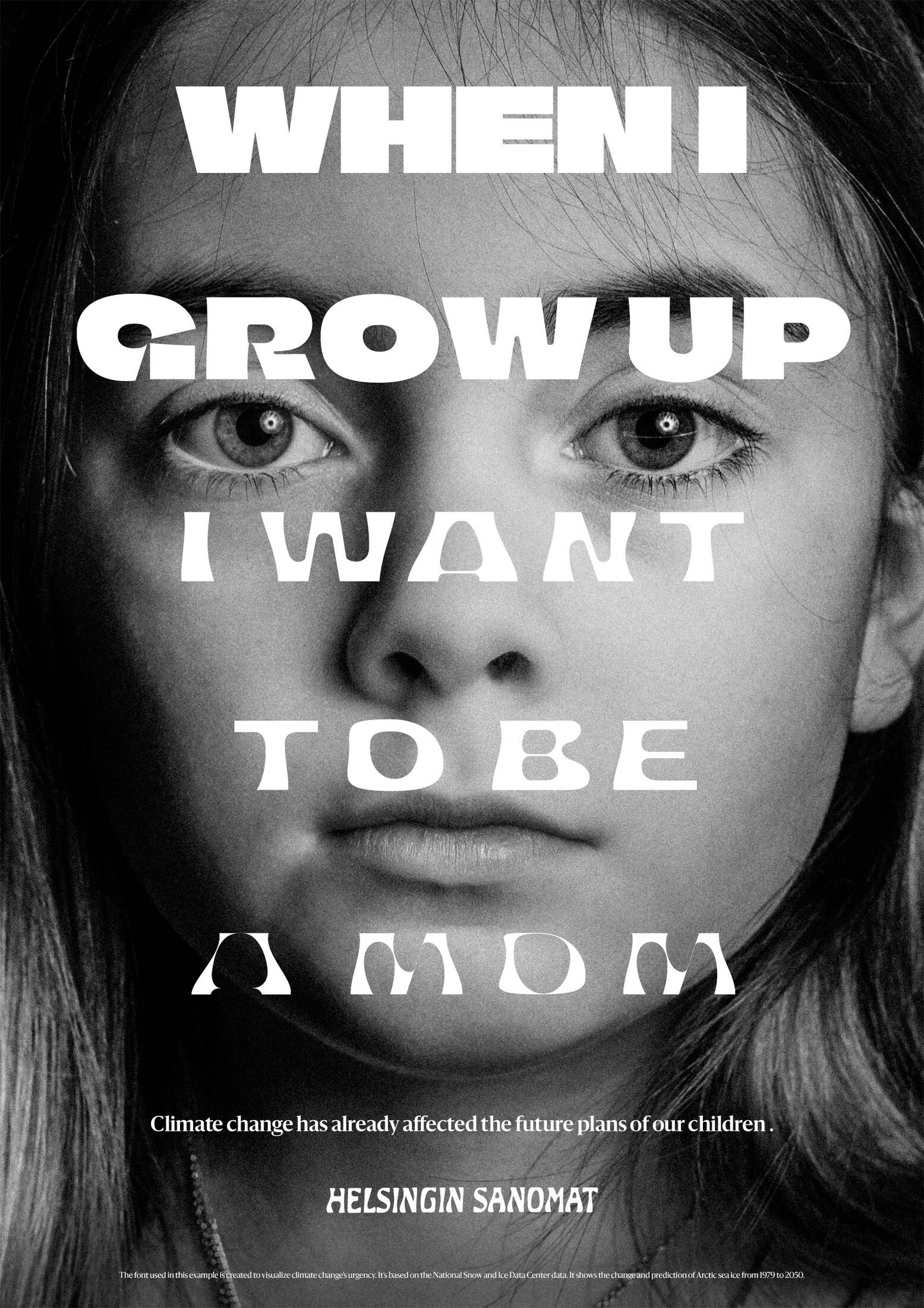 The Climate Crisis Font. A typeface visualizing and concretizing climate change and its impact. Helsingin Sanomat is using the font covering climate issues and is now releasing it for free download to all media outlets, organizations and individuals sharing the concern for our climate.