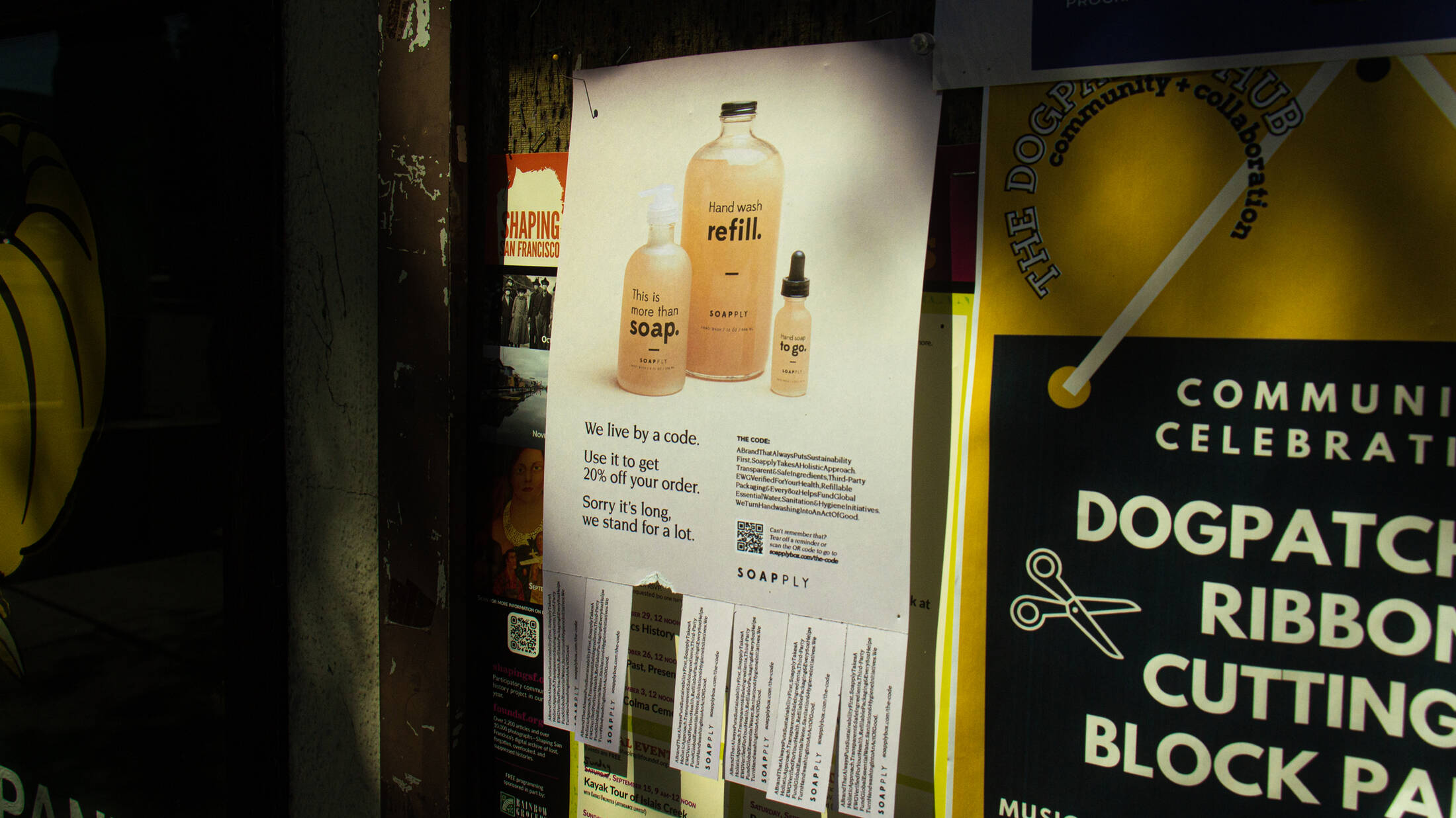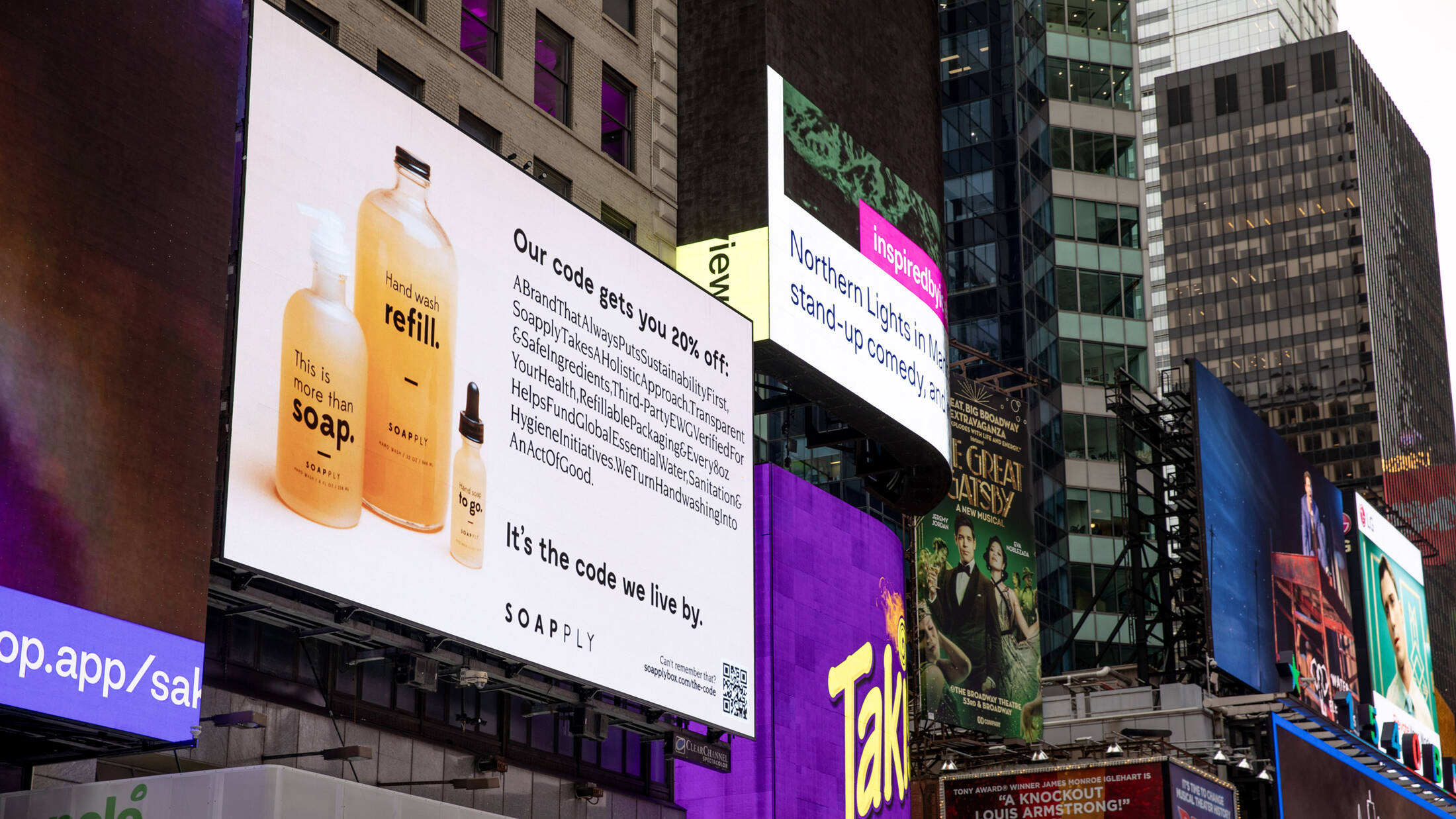 Soapply lives by a code. It's a lofty and commendable code, but it is long. We did our best to smush it into a discount code. Then we put it onto a billboard in Times Square and tacked it up on community bulletin boards across the country.