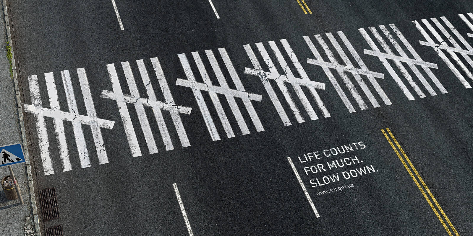 Life counts for much. Slow down. Crossed zebra lines keep their cruel account. This ad works for both divers and pedestrians: drivers will count their days in prison, while pedestrians will have to be more careful near the roads -- in this case they will not add up to the death count as well.