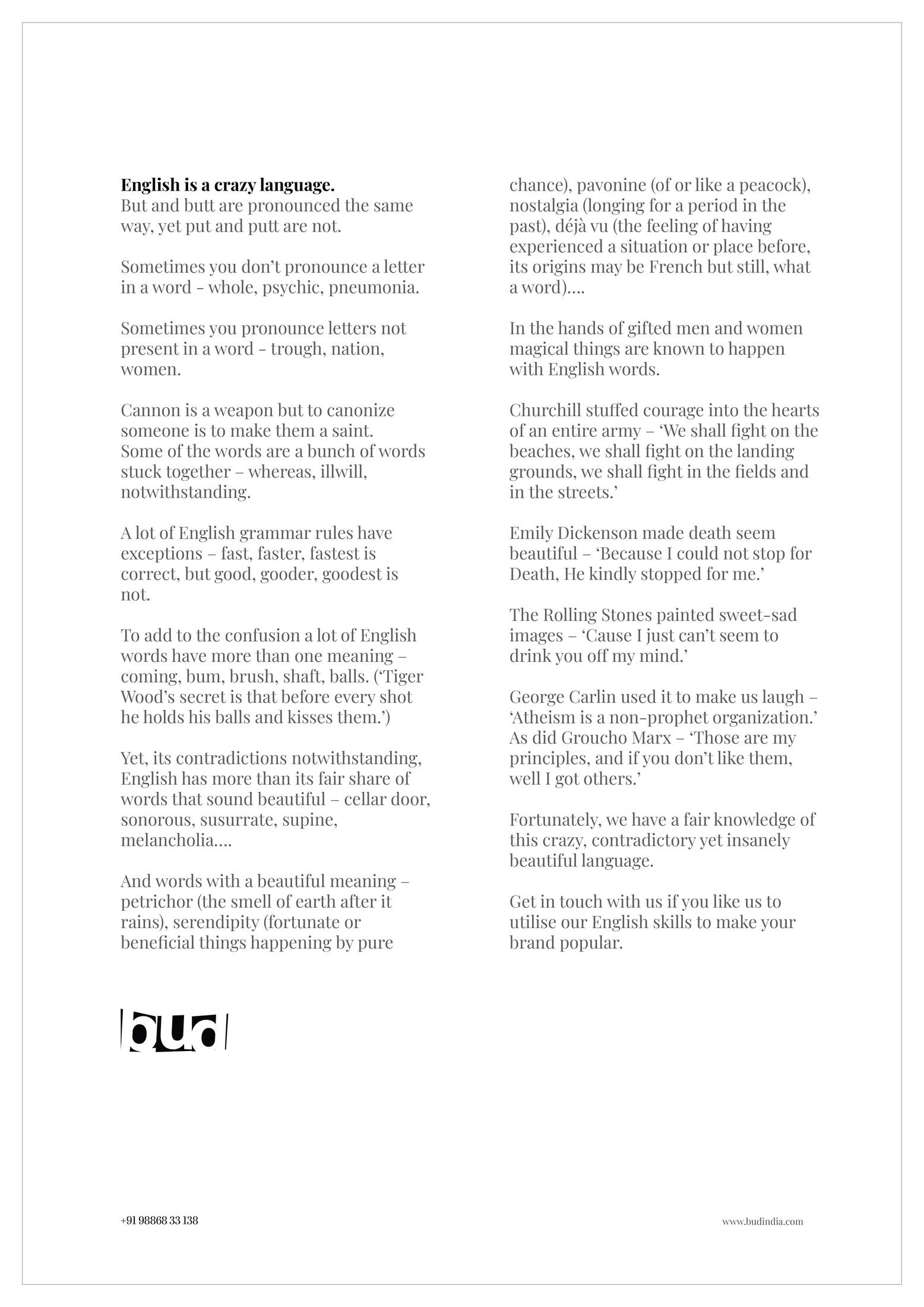 We developed a campaign for Bud that turned the English language itself into a creative playground, using its quirks, contradictions, and wit to demonstrate the agency’s mastery of words and storytelling. In a market where every agency claims to be “creative,” Bud chose to prove it through craft. The long-copy format celebrated the beauty and irony of language, positioning Bud as a thinking agency that transforms words into strategy and insights into impact.
