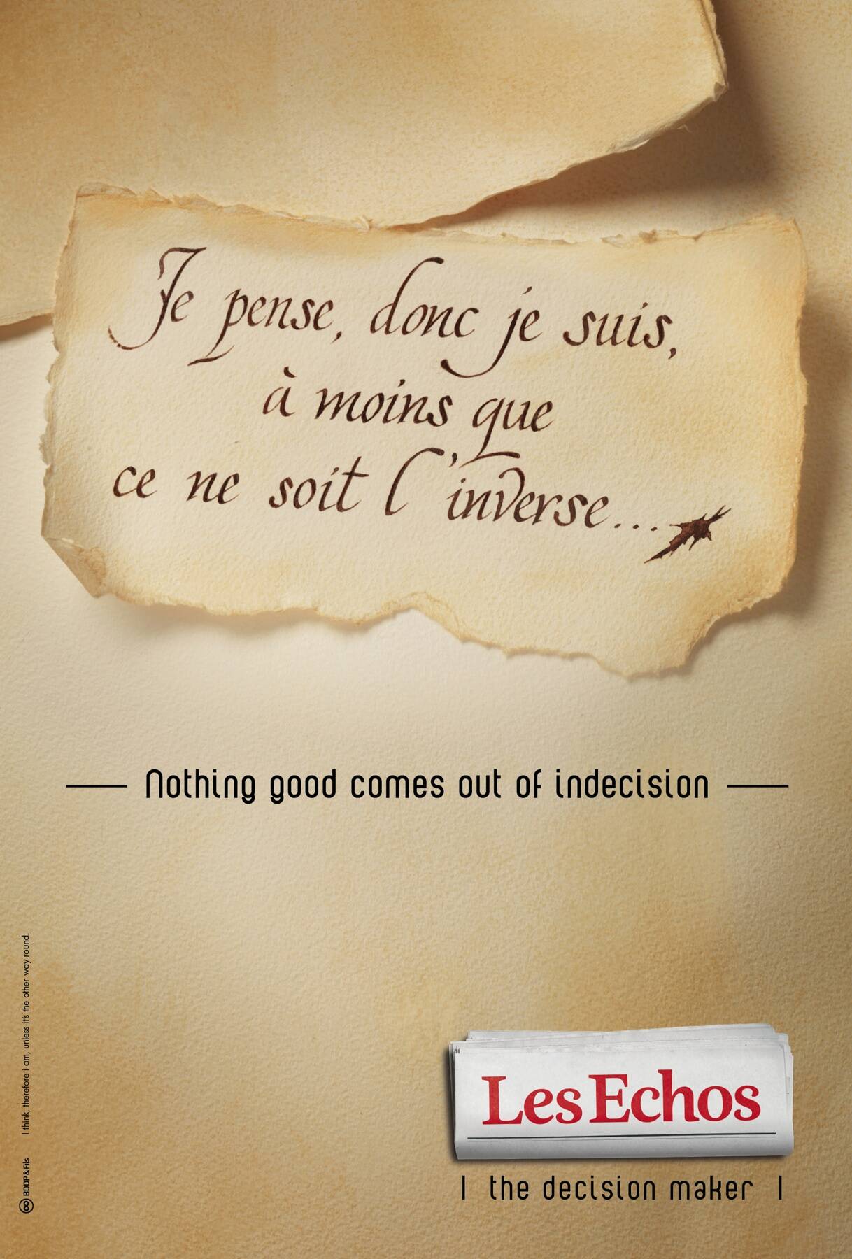 This professional campaign titled 'The decision maker, Veni, The decision maker, Think, The ...' was published in France in October, 2012. It was created for the brand: Les Echos, by ad agency: BDDP. This Print medium campaign is related to the Media industry and contains 4 media assets. It was submitted almost 13 years ago.