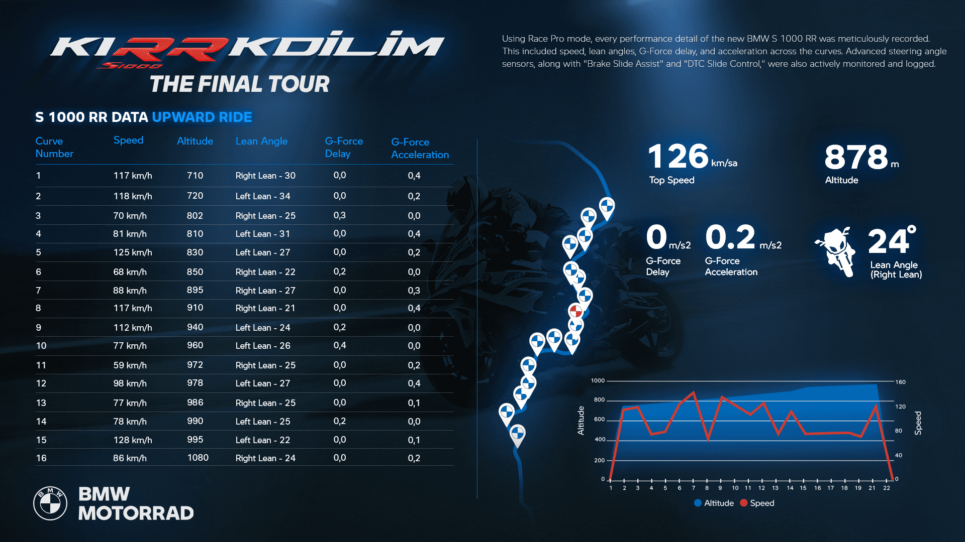 Using the BMW Motorrad Connected App, real-time performance data-speed, altitude, distance, and lean angle was recorded and mapped to each curve, creating an interactive Kırkdilim Ride Data Map on BMW Motorrad Türkiye’s website.