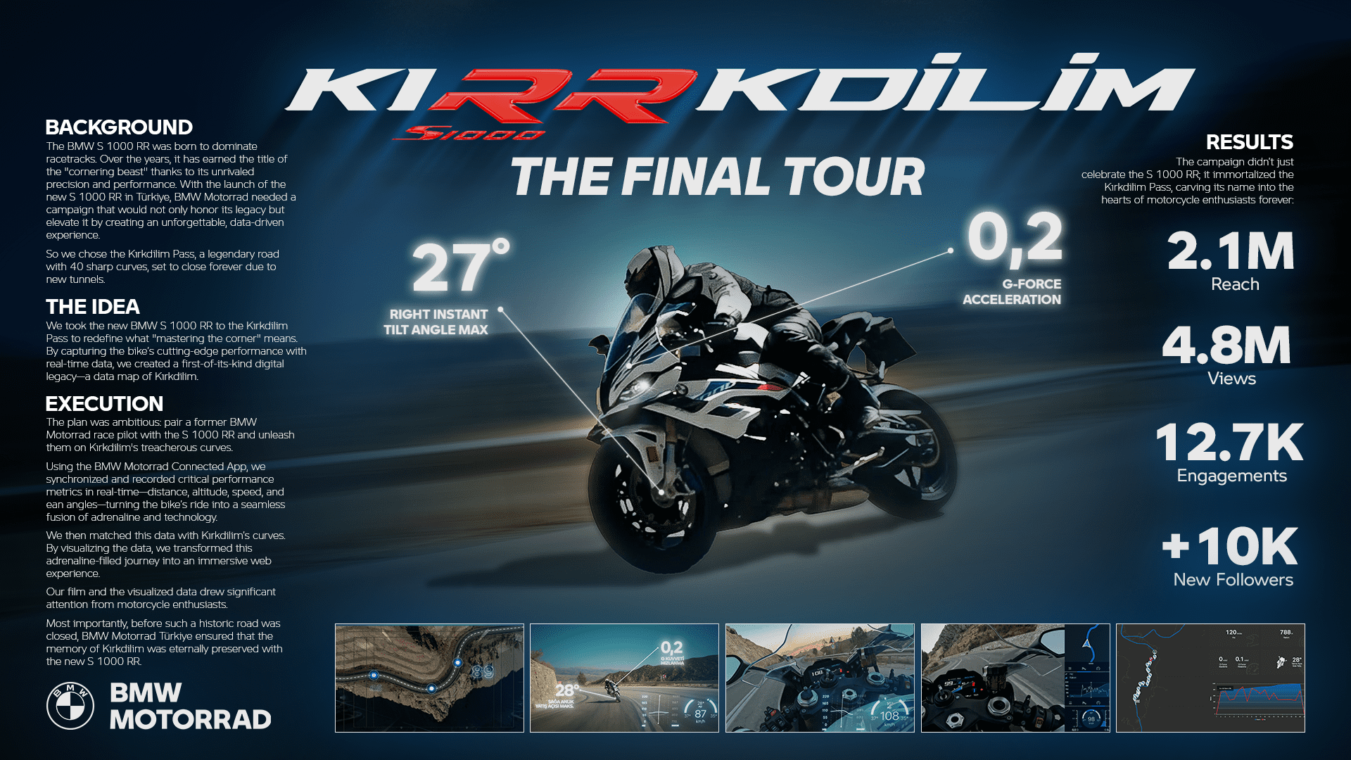This professional campaign titled 'Kırkdilim Pass: The Final Tour' was published in Turkey in January, 2024. It was created for the brand: BMW Motorrad Türkiye, by ad agency: TBWA\Istanbul. This Digital and Experiential media campaign is related to the Automotive and Personal Transportation industry and contains 7 media assets. It was submitted about 11 hours ago by Sr. Creative Copywriter: Gurkan Aksel Akkurt.