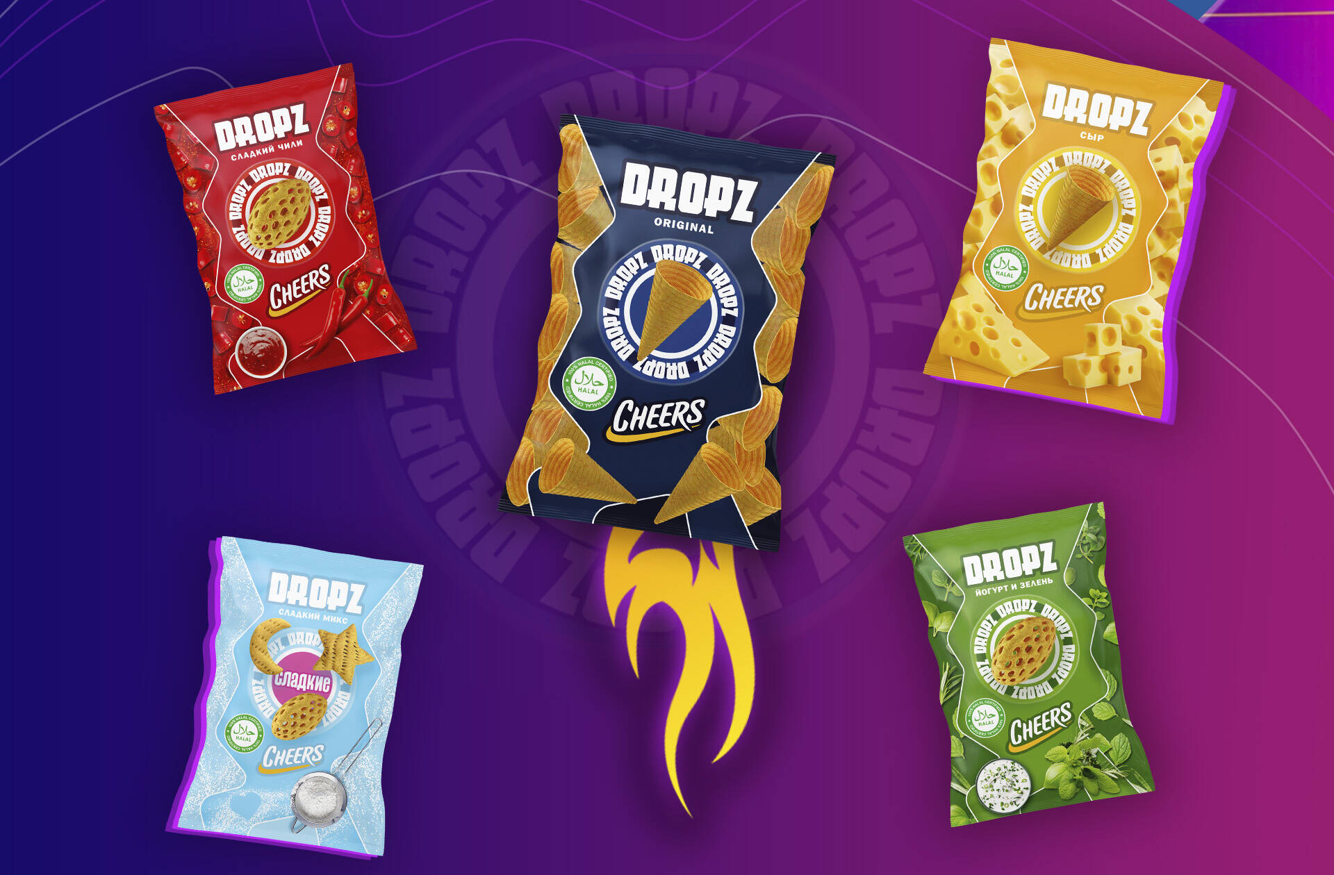 Our task was to create a snack packaging design for the new subline from Cheers — Dropz, which stands out with its unique shape for the entire Uzbek market.