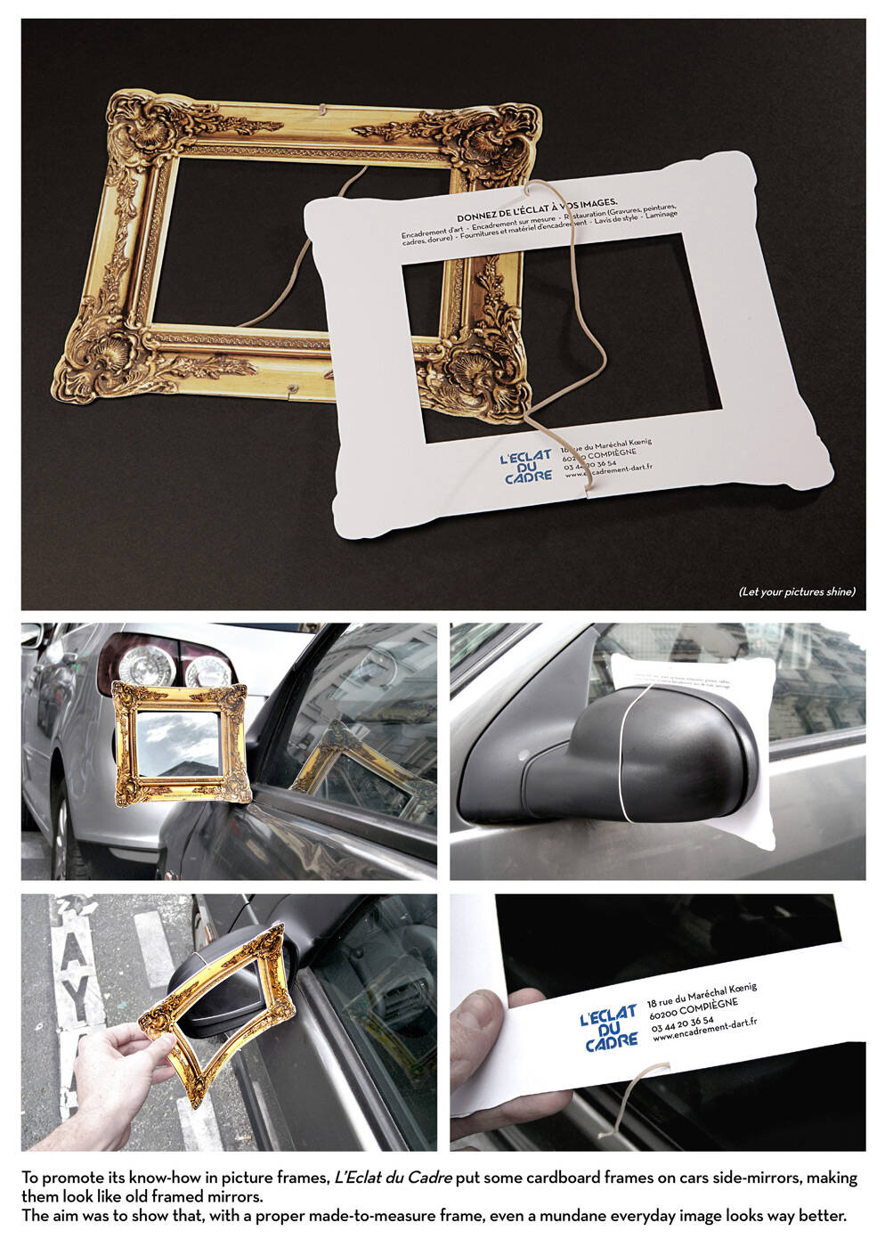 This professional campaign titled 'The frame guerilla' was published in France in December, 2009. It was created for the brand: Eclat du Cadre, by ad agency: BDDP. This Ambient medium campaign is related to the Professional Services industry and contains 1 media asset. It was submitted almost 16 years ago.