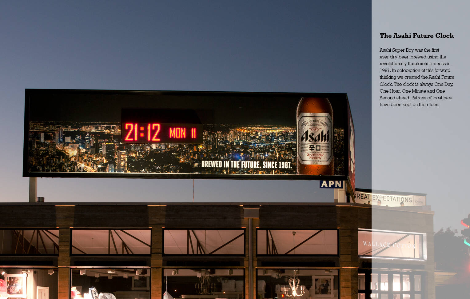 Asahi Super Dry was the first ever dry beer, brewed using the revolutionary Karakuchi process in 1987. In celebration of this forward thinking Barnes, Catmur Auckland created the Asahi Future Clock. The clock is always One Day, One House, One Minute and One Second ahead. Patrons of local bars have been kept on their toes. read less...