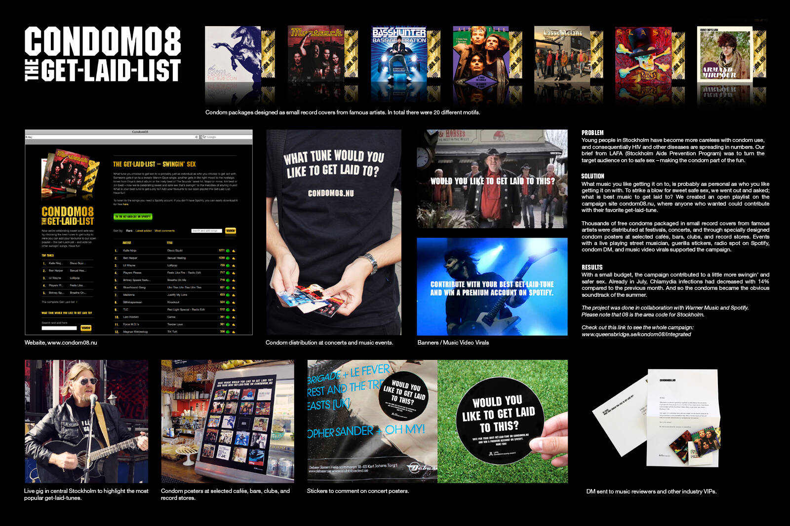 This professional campaign titled 'The get-laid-list' was published in Sweden in June, 2010. It was created for the brand: Condom08, by ad agency: Ester. This Ambient medium campaign is related to the Public Interest industry and contains 1 media asset. It was submitted about 15 years ago.