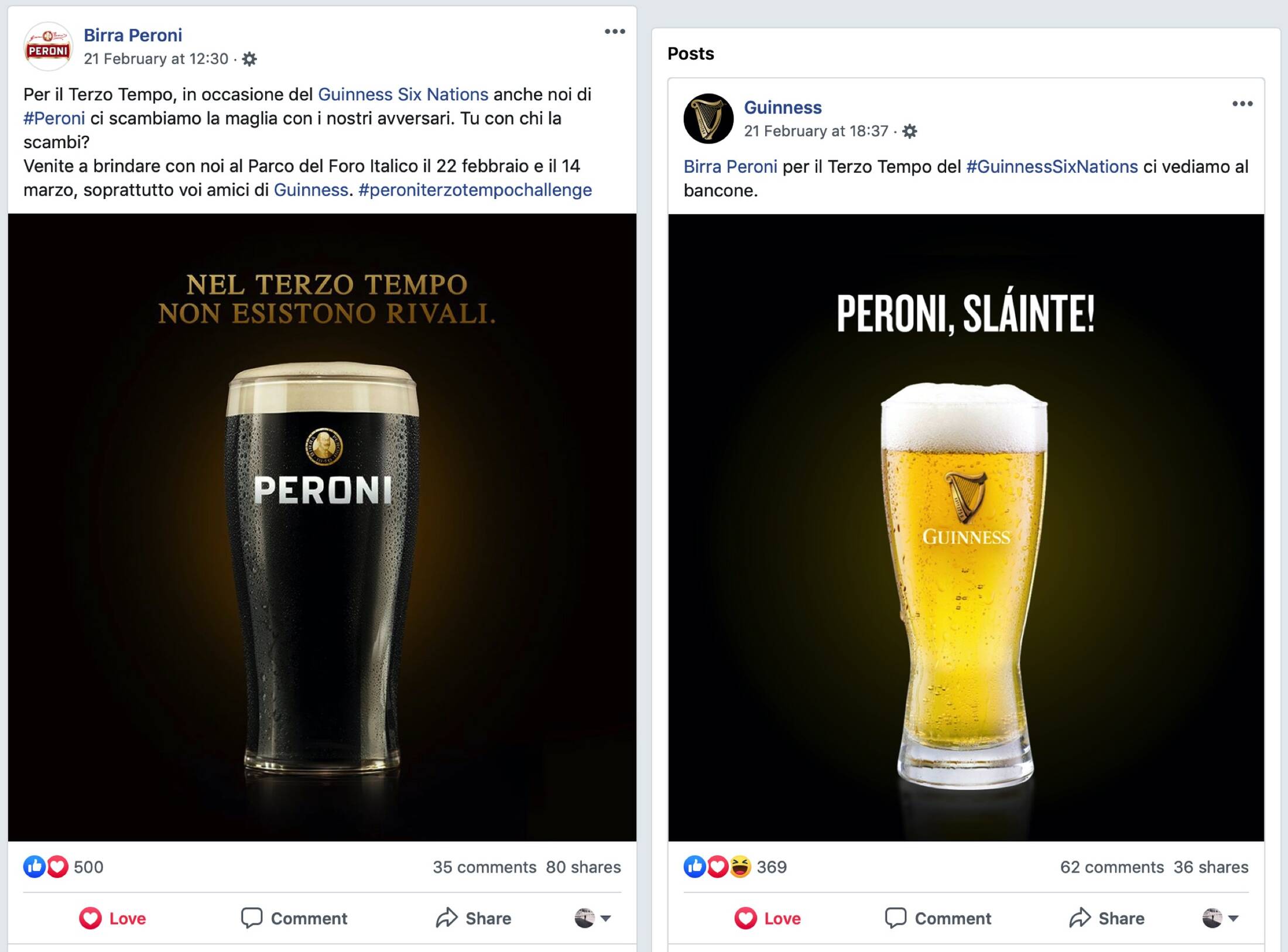 When a Six Nations rugby match ends, the players of the two national teams socialize drinking together as a sign of fair play and the so-called “third half” officially begins. We developed an idea inspired by this consolidated ritual in the world of rugby. Birra Peroni (the most popular Italian beer, the Italian official sponsor of the Italian Rugby National team and of the Third Half Event at the SixNations) symbolically exchanged its traditional glass with one of his main competitor: Guinness beer (the main international sponsor of Six Nations) before the game played at the Olympic stadium in Rome. And after a few hours, Guiness spontaneously switched the glass as well. The symbolic exchange took place on Facebook and Instagram, and saw the participation of the two beer brands to promote the noble values of sport and inviting fans to join the Peroni Terzo Tempo Village