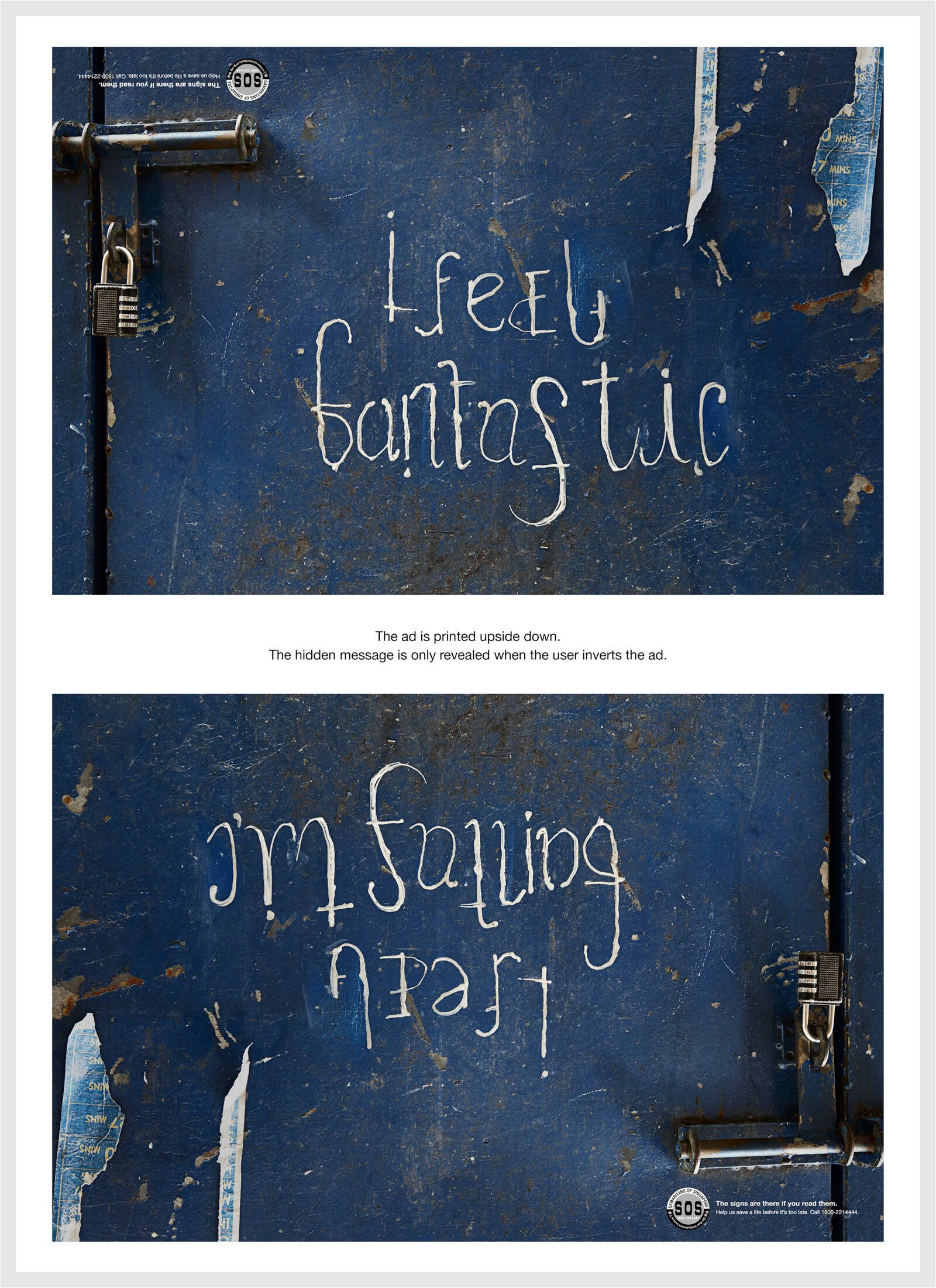 Pain isn’t always obvious. To show how we often miss the warning signs, we created ambigrams and printed the ads upside down in magazines. At first glance, the reader sees a positive phrase. But when the ad is inverted, the copy reveals a sentiment quite the opposite – revealing the hidden feelings of those who are lost and depressed.