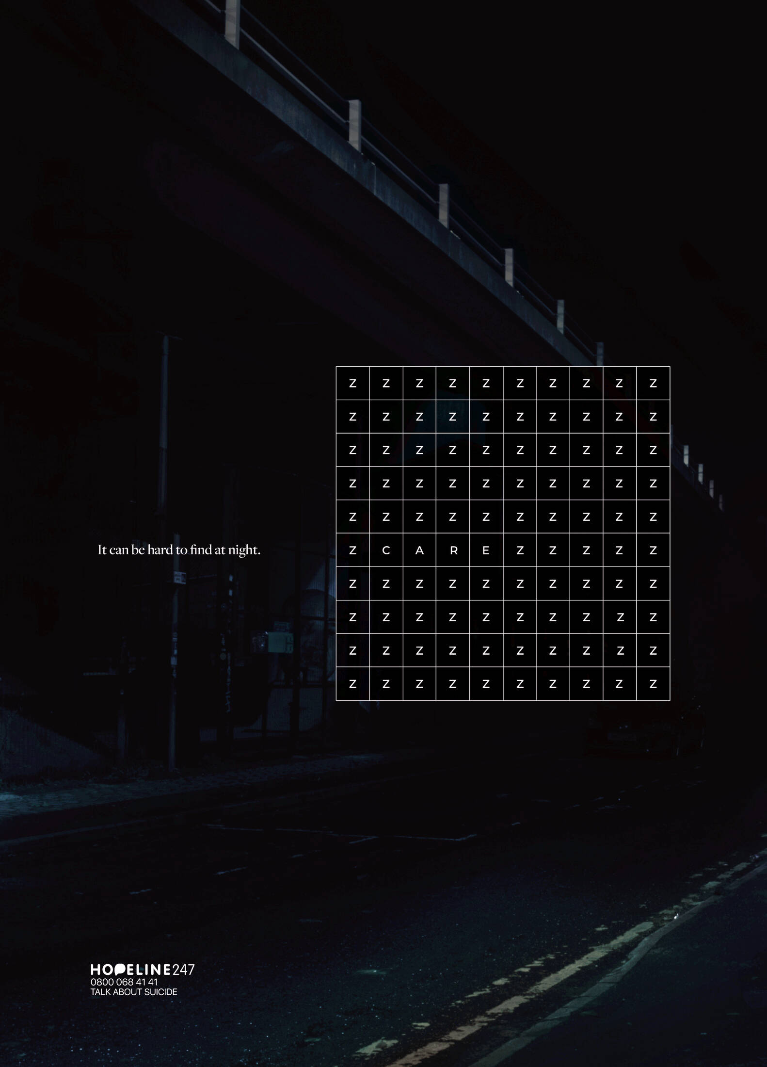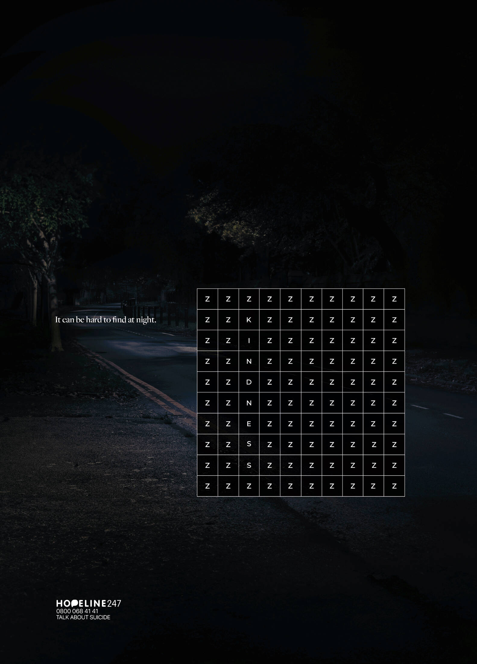 To launch PAPYRUS’s new 24/7 suicide helpline, HOPELINE247, we used stark night-time photography and a simple wordsearch. Lost in the Zs of sleep, are all the words of support a suicidal person may be looking for at this time.
