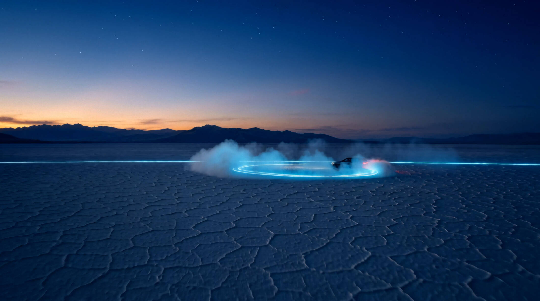 Becky Evans' hypnotic test drive: drifting across a limitless salt flat.