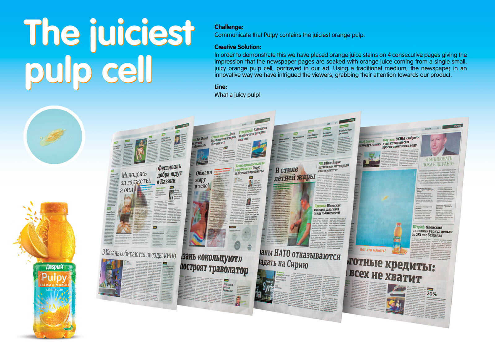 This professional campaign titled 'The juiciest pulp' was published in Russia in September, 2013. It was created for the brand: Pulpy, by ad agency: Saatchi & Saatchi. This Print medium campaign is related to the Drinks (Non Alcoholic) industry and contains 1 media asset. It was submitted about 12 years ago.