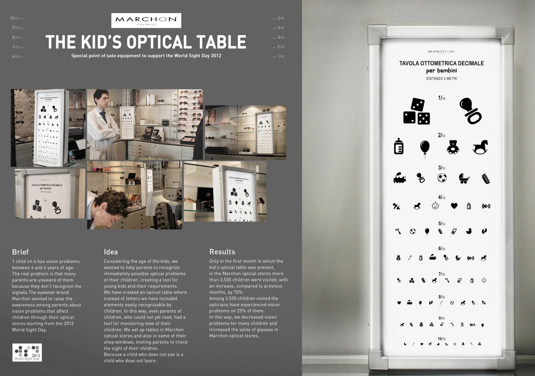 This professional campaign titled 'The Kid's Optical Table' was published in Italy in October, 2012. It was created for the brand: Marchon Eyewear, by ad agency: Bcube. This OOH Outdoor medium campaign is related to the Personal Accessories industry and contains 1 media asset. It was submitted about 12 years ago.