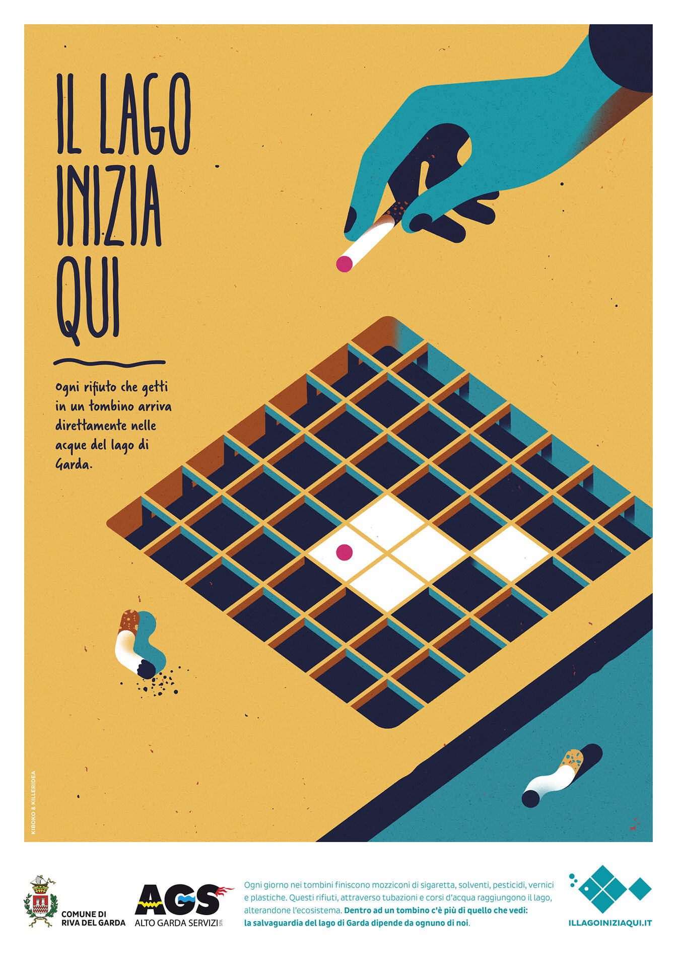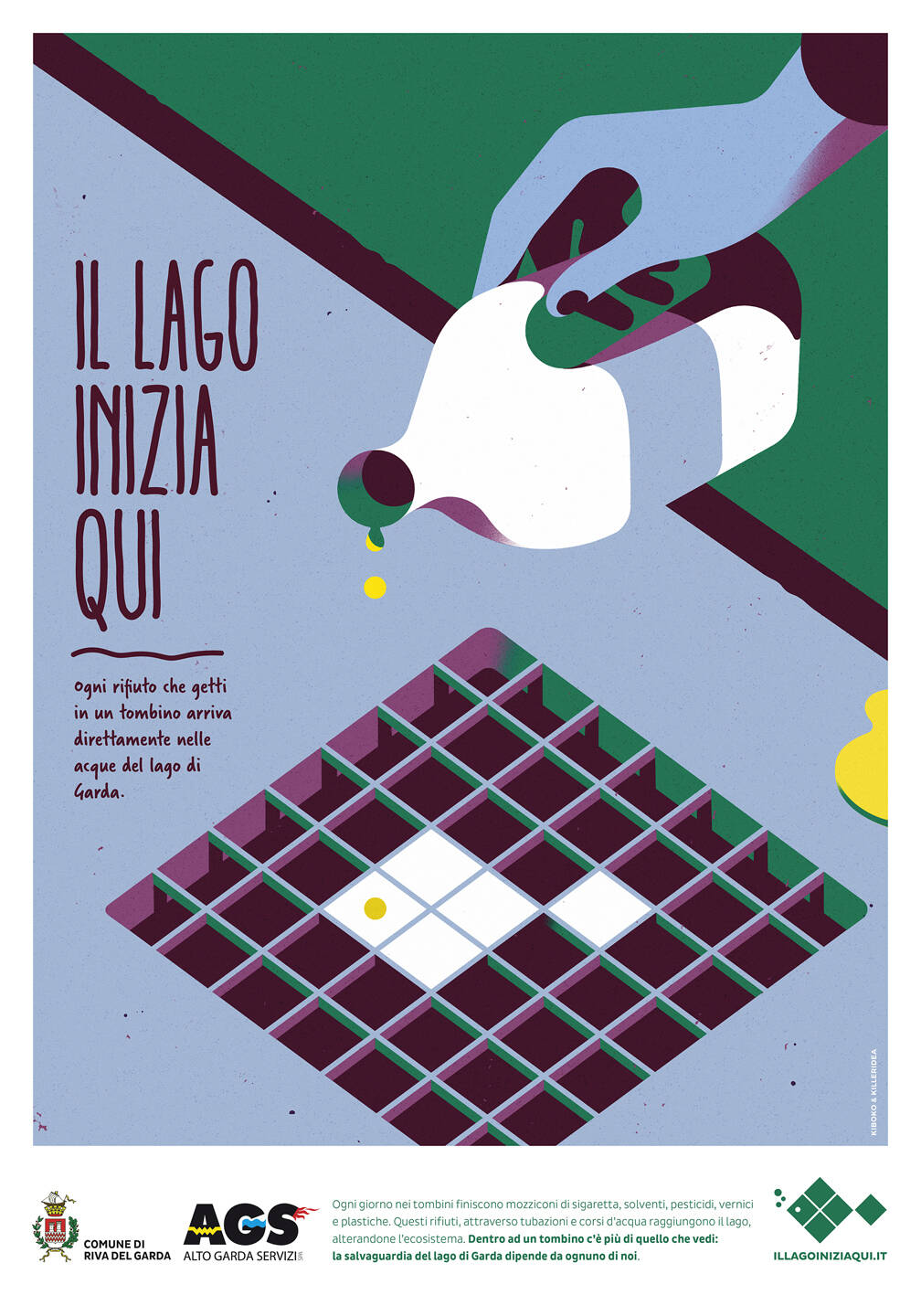 the lake starts here, Any waste you throw into a manhole goes directly into the waters of Lake Garda. Every day cigarette butts, solvents, pesticides, paints and plastics end up in the manholes. These waste, through pipes and water courses, reach the lake, altering its ecosystem. Inside a manhole there is more than what you see: the protection of Lake Garda depends on each of us.