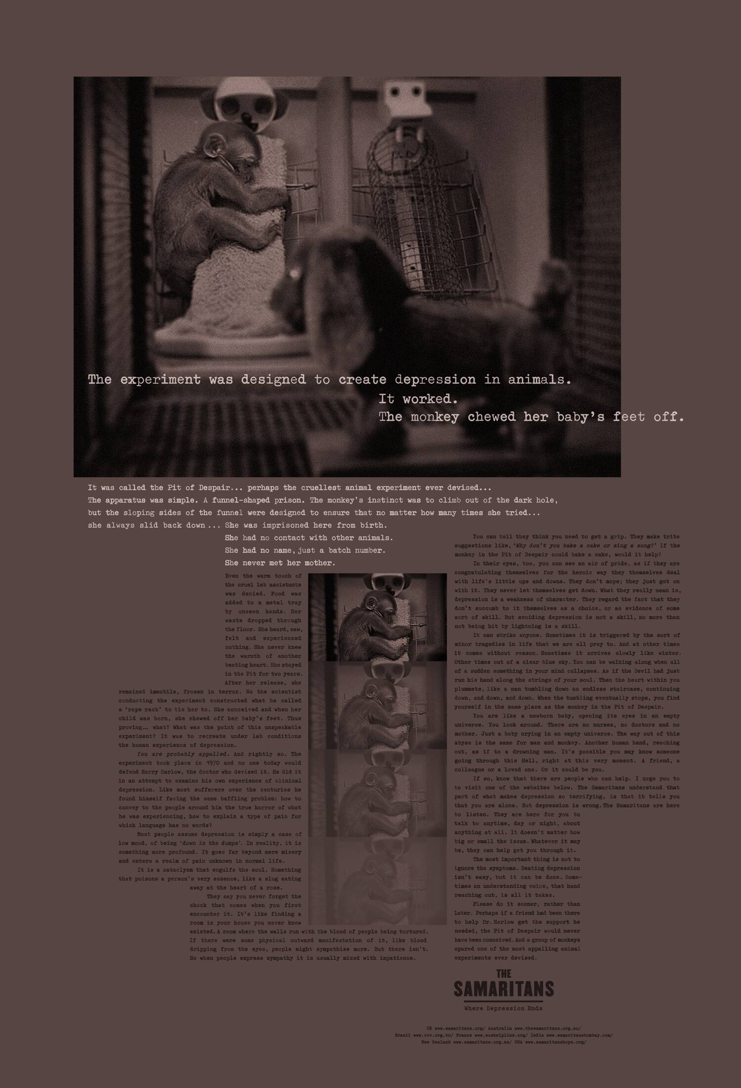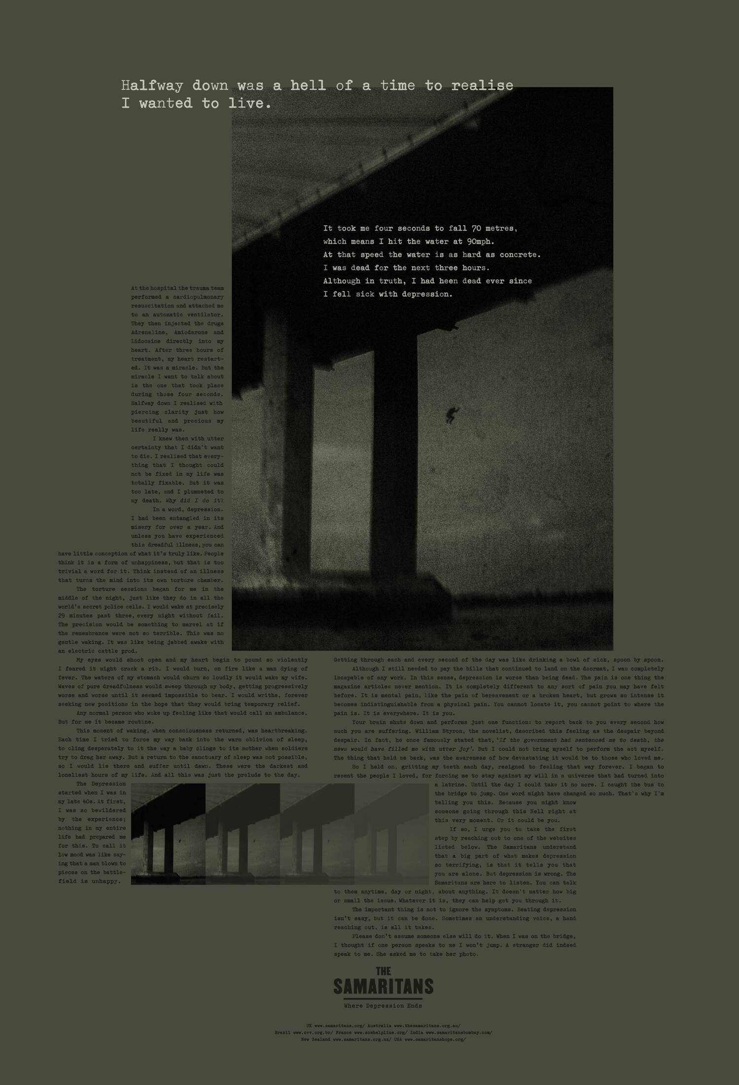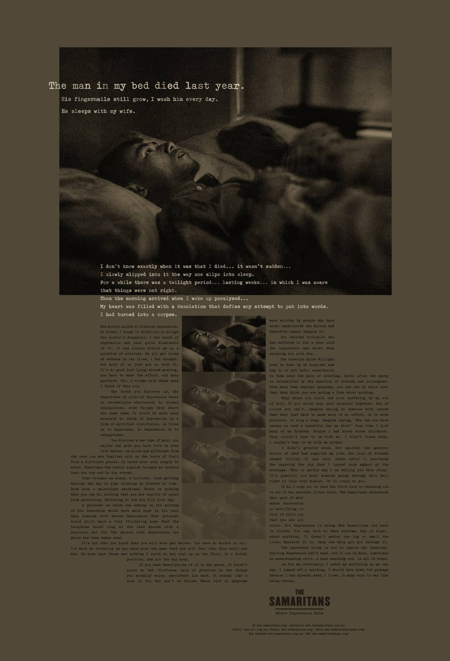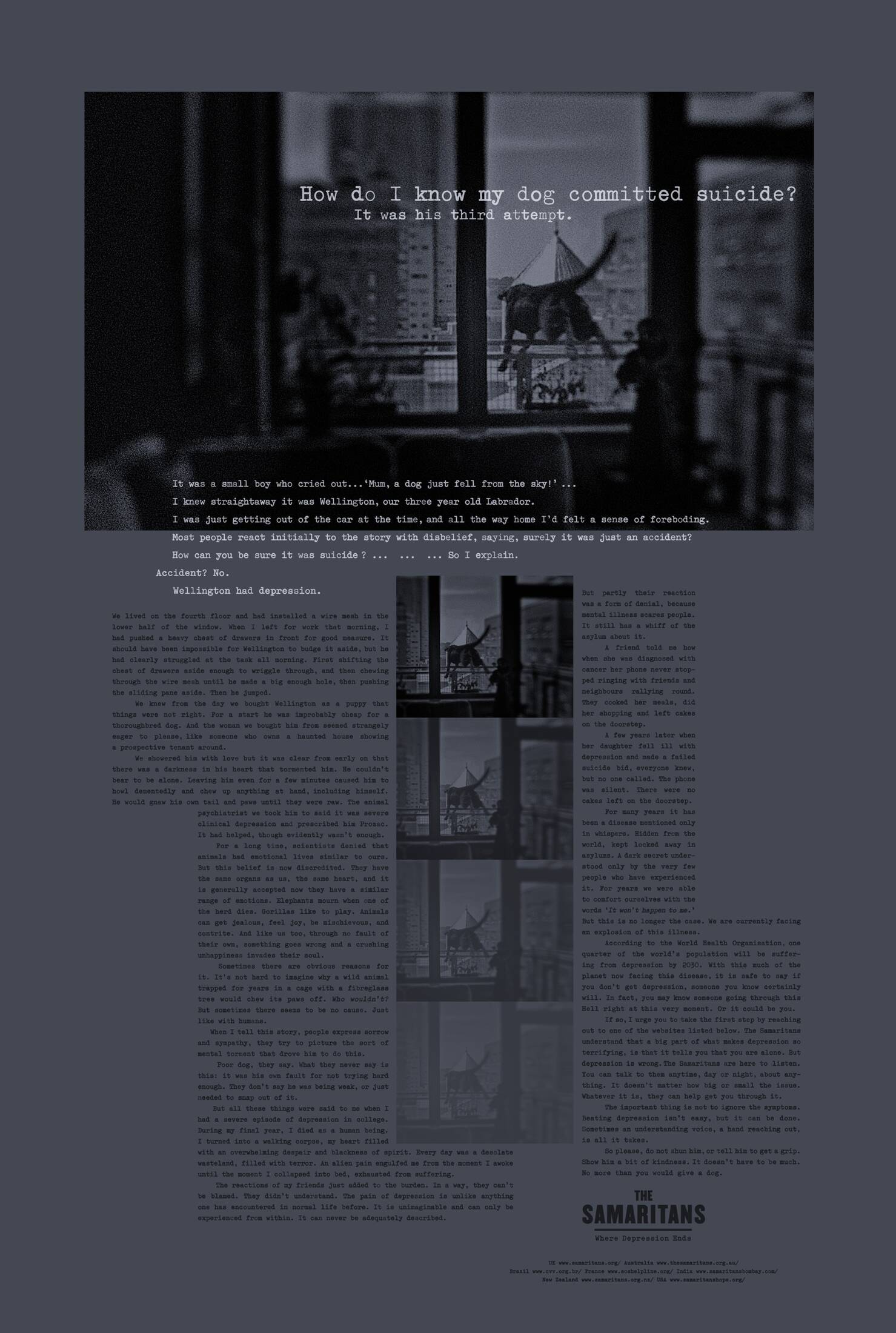 This professional campaign titled 'The man in my bed, Dog suicide, Depression, Halfway down' was published in Vietnam in July, 2015. It was created for the brand: The Samaritans, by ad agency: Ogilvy. This Print medium campaign is related to the Public Interest industry and contains 4 media assets. It was submitted over 10 years ago.