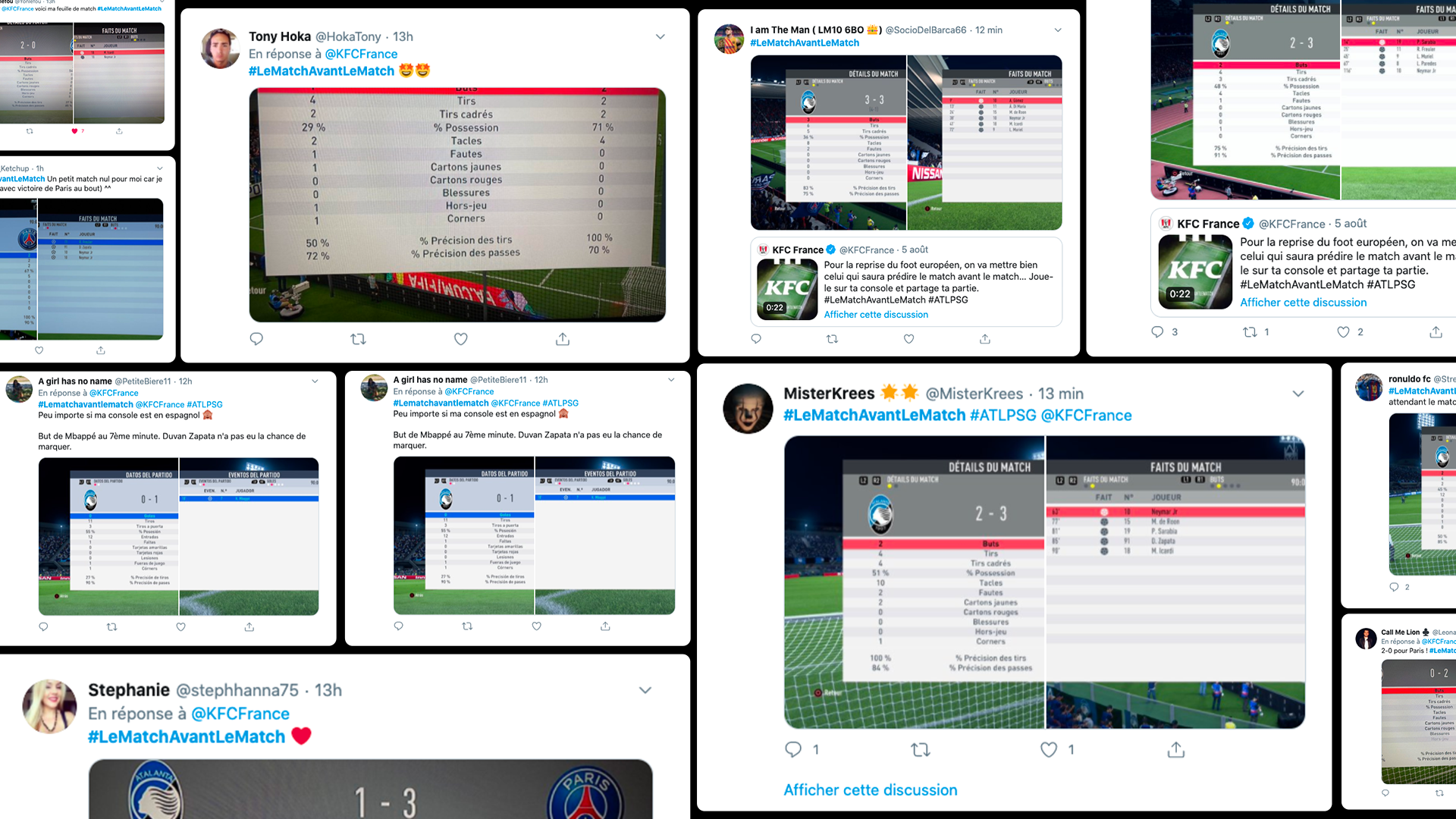 After a 5-month hiatus, football is back on. To celebrate the return of the Champions League on August 12th, KFC issued a challenge to all players online: "The Match Before the Match". One week before the official "Atalanta v PSG" match, we tweeted the challenge, reaching 2.8M users, inviting gamers on Twitch to pit the teams together on FIFA. For seven days, gamers played out their predictions and shared them with KFC on Twitter via the hashtag #lematchavantlematch. On the day of the match, gamers gathered to watch the real showdown and find out who had the closest outcome. During the live show, KFC and its agency Sid Lee set up a war room to analyze and compare the games of the players against the official match in real time. The winner, who predicted PSG’s victory with a score of 2-1, was offered KFC deliveries for himself and his friends during each of the remaining championship games. The operation, which ran from August 5th through the 12th, further anchors KFC in pop culture. Using Twitch, FIFA, and UEFA, the brand is able to reach their core consumers, millennials and gen Z, and firmly establish KFC as a game day ritual, online and off.