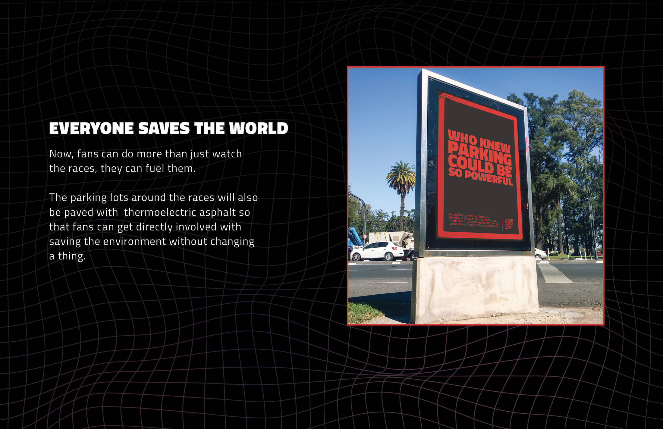 This student campaign titled 'The Most Electric Bet' was published in United States in December, 2025. It was created for the brand: F1, by ad school: S.I. Newhouse School of Public Communications. This Experiential medium campaign is related to the Sports industry and contains 8 media assets. It was submitted about 9 hours ago.