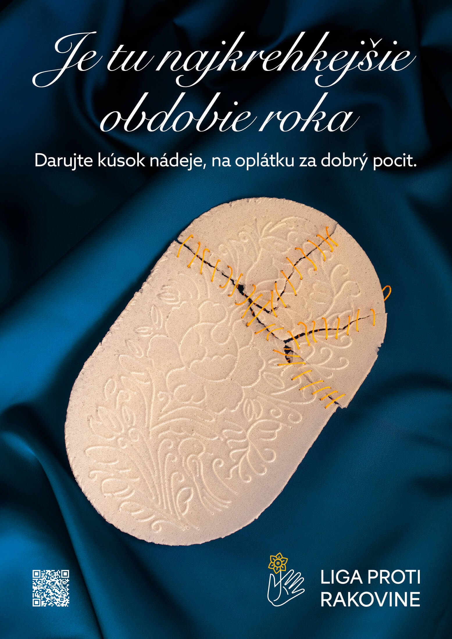 For the visual, a wafer handmade by one of the patients was intentionally broken and then carefully stitched back together. A thin yellow thread was used to reconnect the fragments into a single piece. The thread symbolizes the gentle yet powerful bond created by Liga proti rakovine — connecting patients, families, doctors, and experts, and holding the community together during one of the most sensitive times of the year.