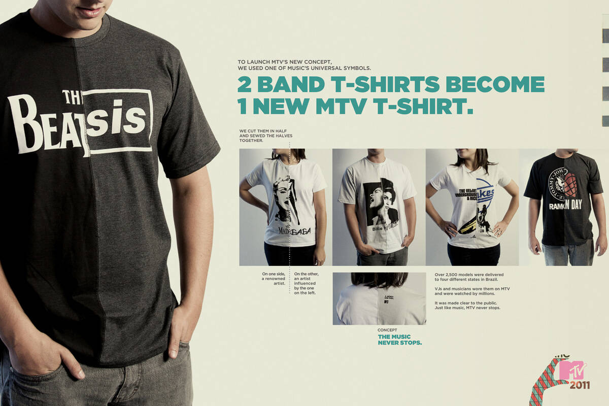 To launch MTV’s new concept - The music never stops - we used one of music’s universal symbols: the band t-shirt. We selected t-shirts of artists of different generations. Then we cut them in half and sewed the halves together. On one side, an artist of the current generation. On the other, an artist who influenced him. Over 2,500 models were delivered to four different states in Brazil. VJs and musicians wore them on MTV and were watched by millions. It was made clear to the public. Just like music, MTV never stops.
