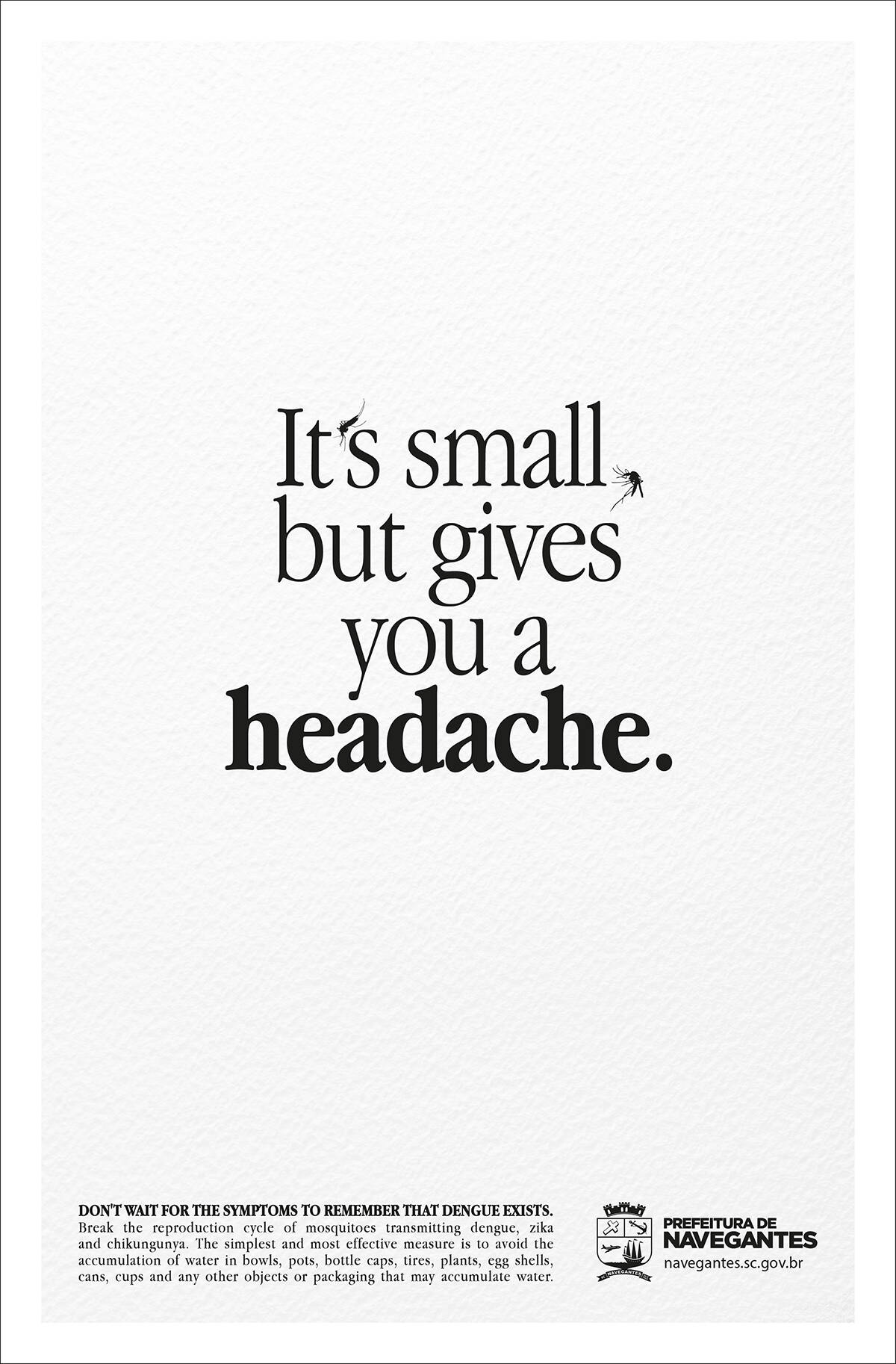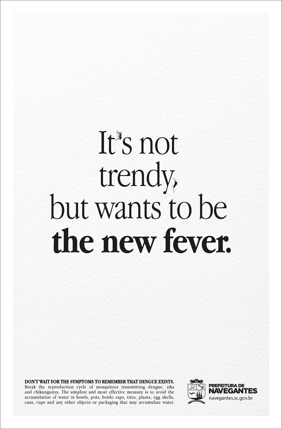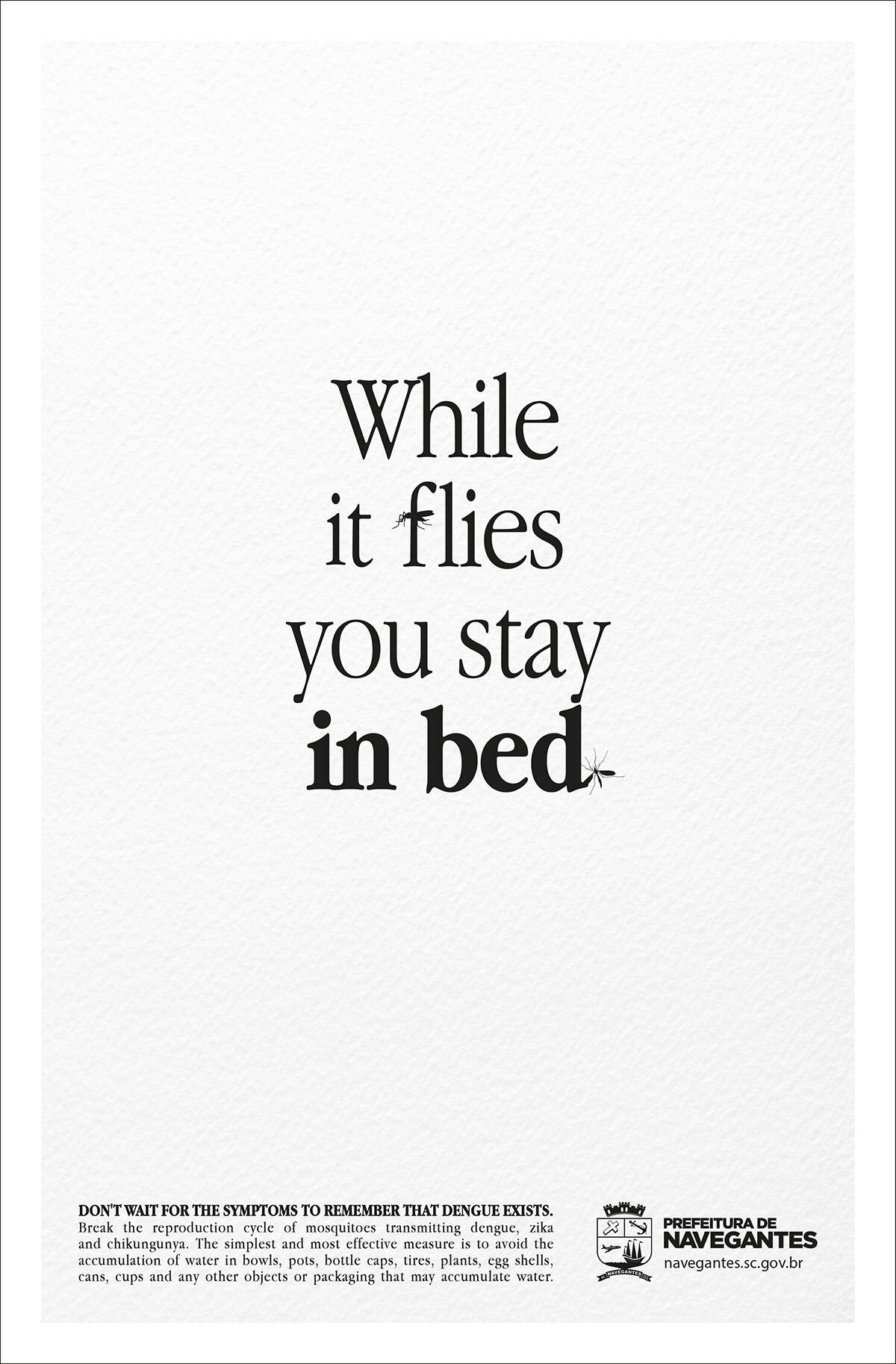 This professional campaign titled 'The new fever, In bed, Headache, Breathlessness' was published in Brazil in December, 2016. It was created for the brand: Prefeitura Municipal de Navegantes, by ad agency: Tatticas. This Print medium campaign is related to the Public Interest industry and contains 4 media assets. It was submitted almost 9 years ago.