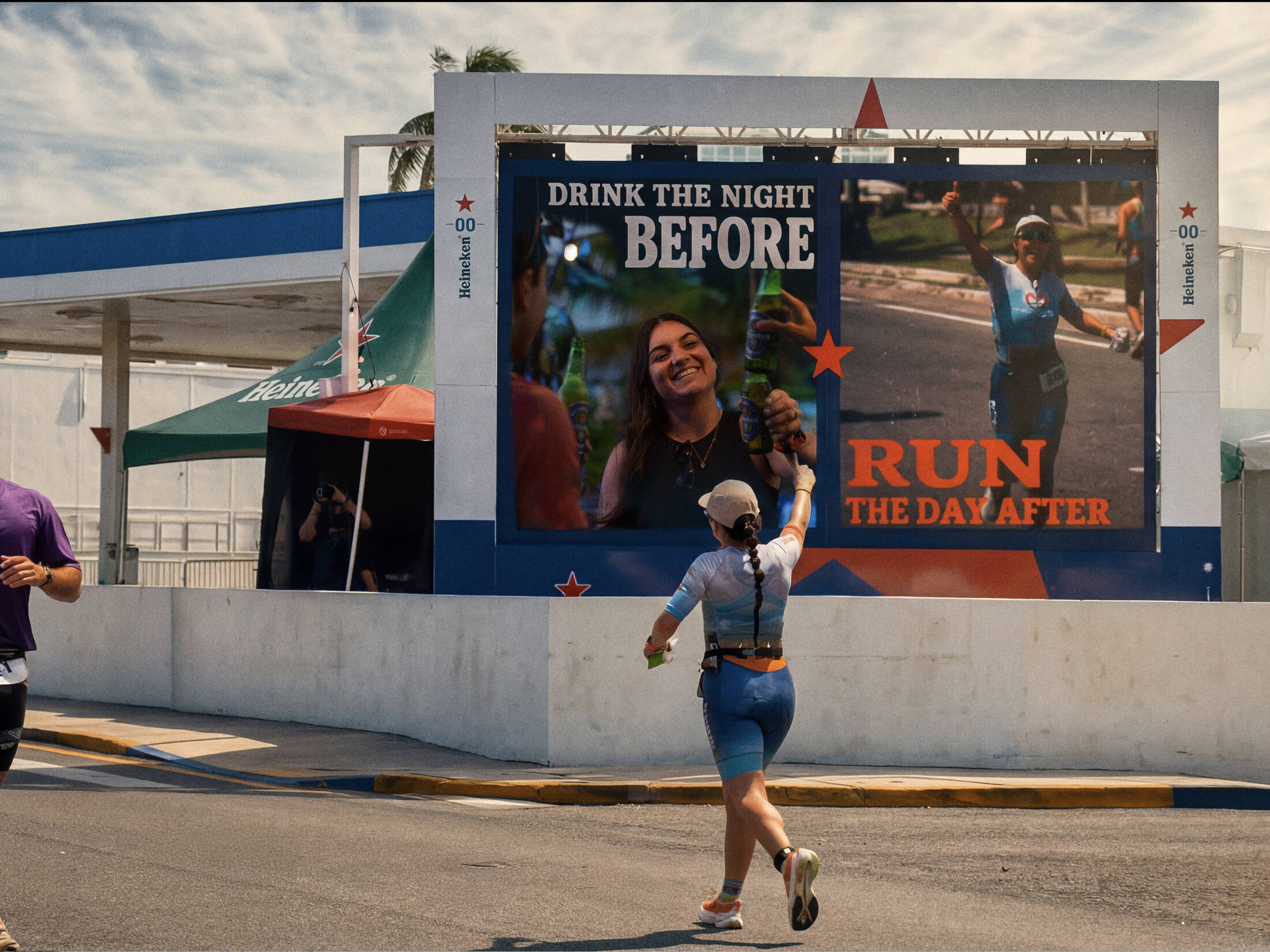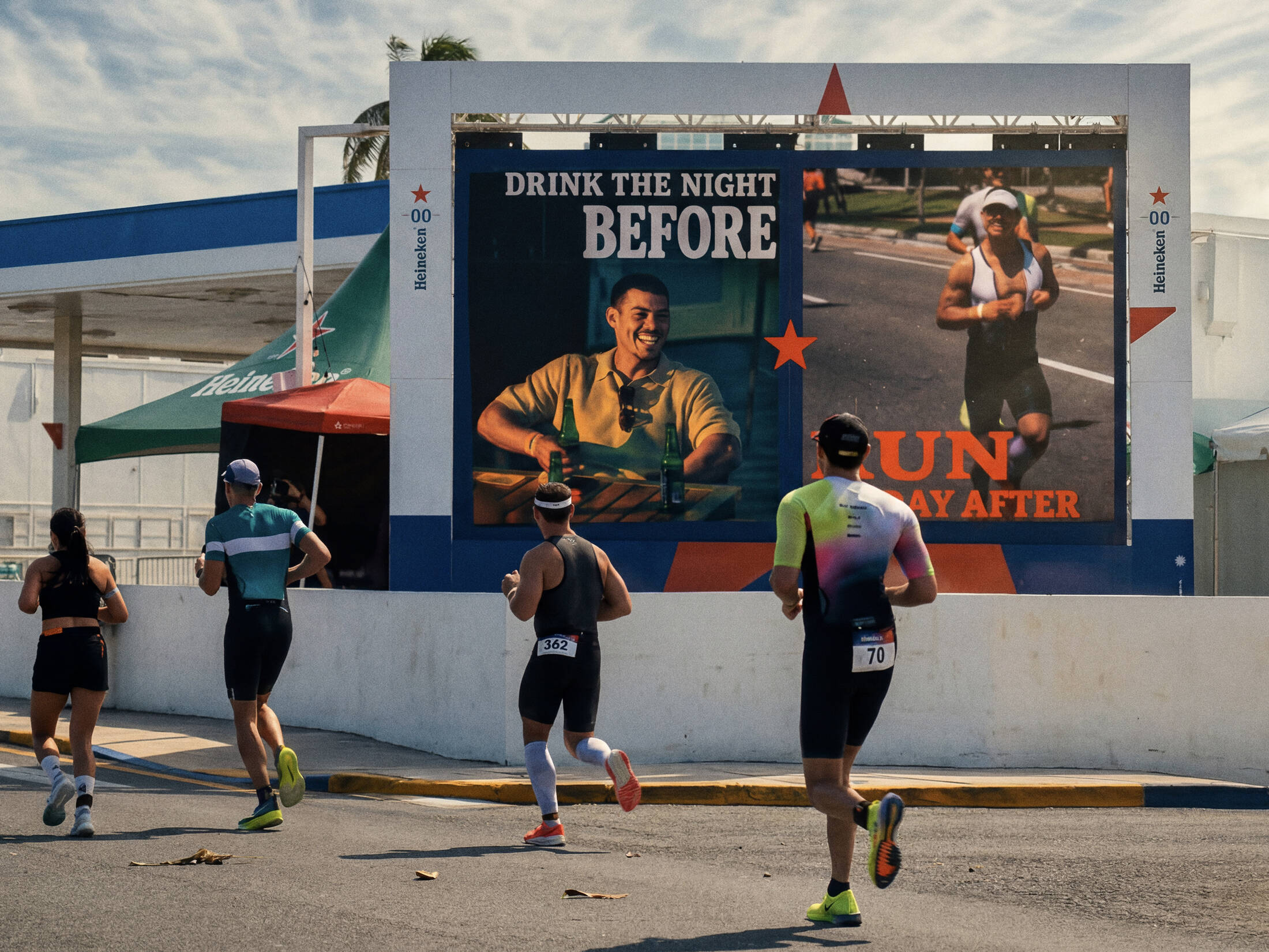 During the event, images of athletes toasting with Heineken 0.0 were captured. The following day, during the running segment of the race, a giant screen along the course showed runners live as they passed by. In that moment, the screen split in two: on one side, their live image running; on the other, a photo of them from the night before enjoying a Heineken 0.0, accompanied by the message: “Drink the night before. Run the day after. Now you can.”