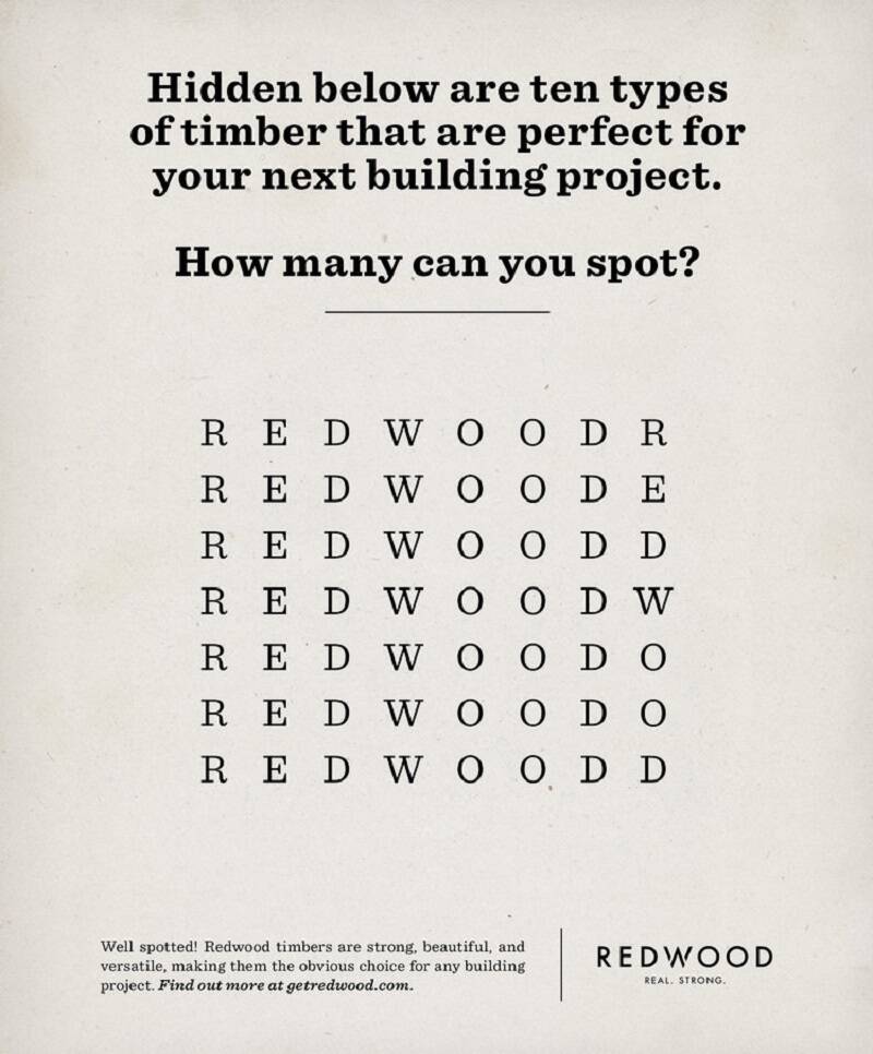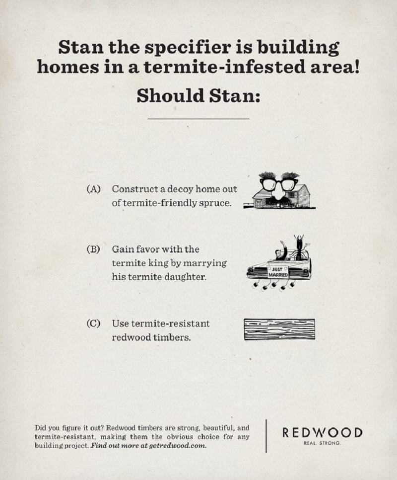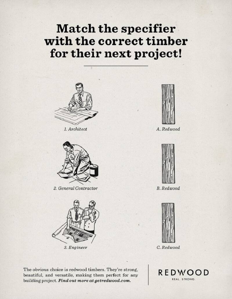 Humboldt Redwood is the largest supplier of redwood in California. This year they wanted to target specifiers (the people who select building materials for construction projects) to educate them on why redwood timbers were the ideal building material compared to other types of wood. We created a print campaign for trade publications popular among the specifier audience that focused on the many reasons why redwood timbers are “the obvious choice” when it comes to choosing building materials.