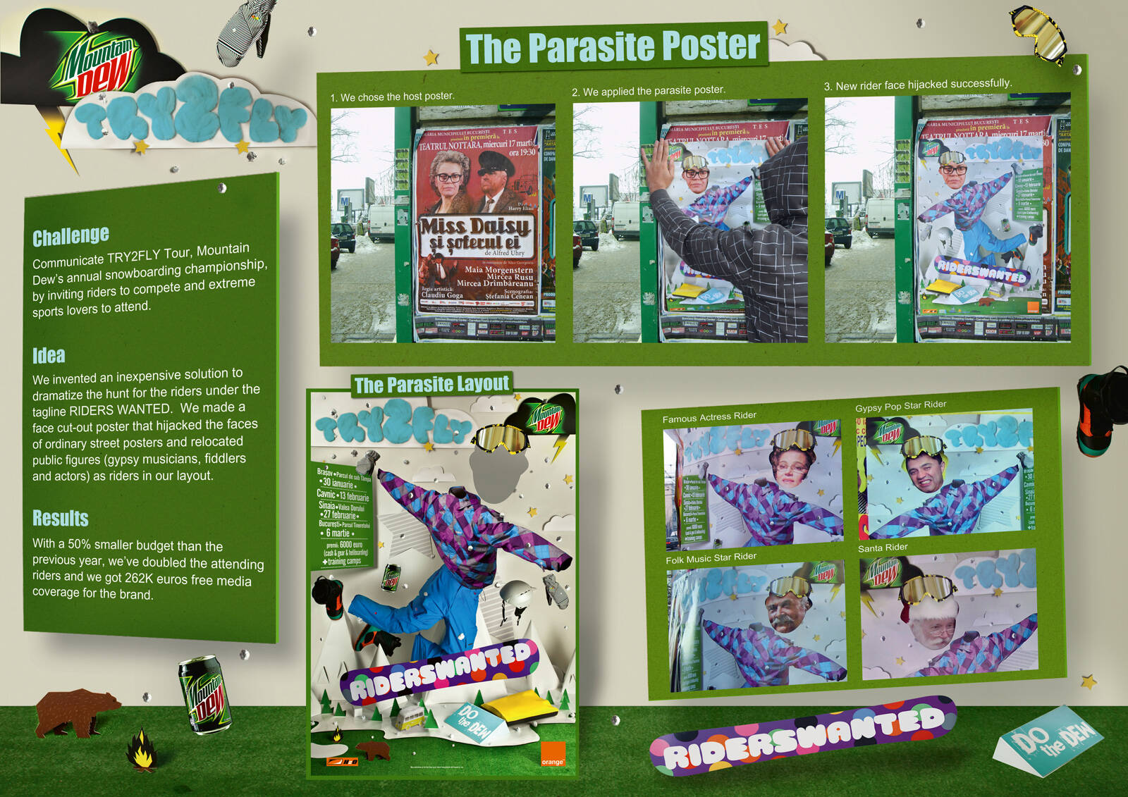 This professional campaign titled 'The Parasite Poster' was published in Romania in November, 2010. It was created for the brand: Mountain Dew, by ad agency: BBDO. This OOH Outdoor medium campaign is related to the Drinks (Non Alcoholic) industry and contains 1 media asset. It was submitted about 15 years ago.