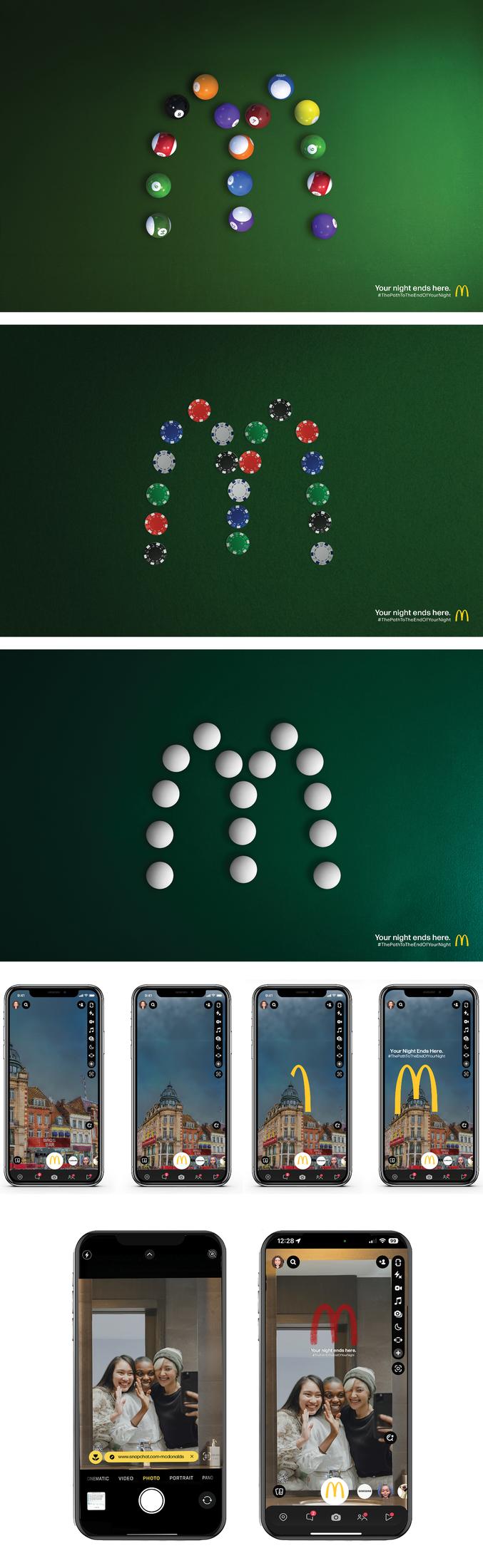For this integrated campaign, the problem was to use the McDonald's arches to communicate a message. With a target audience of 21-28-year-olds, we used the insight that people often visit quick-service restaurants after a late night out. We decided to use the McDonald's arches as the consumers' path to the end of their night, guiding people (literally) to ending their night right with McDonald's.