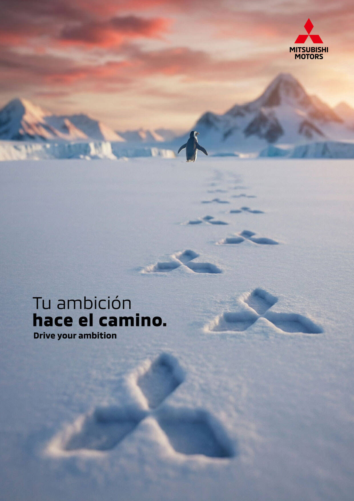 Beyond the metaphor, the art direction hides a powerful brand signature: the penguin's footprints in the snow are strategically placed to form three bifurcations that mirror the iconic three diamonds of the Mitsubishi logo. This visual reinforces that even in the most unconventional paths, the brand's identity and power are always present.