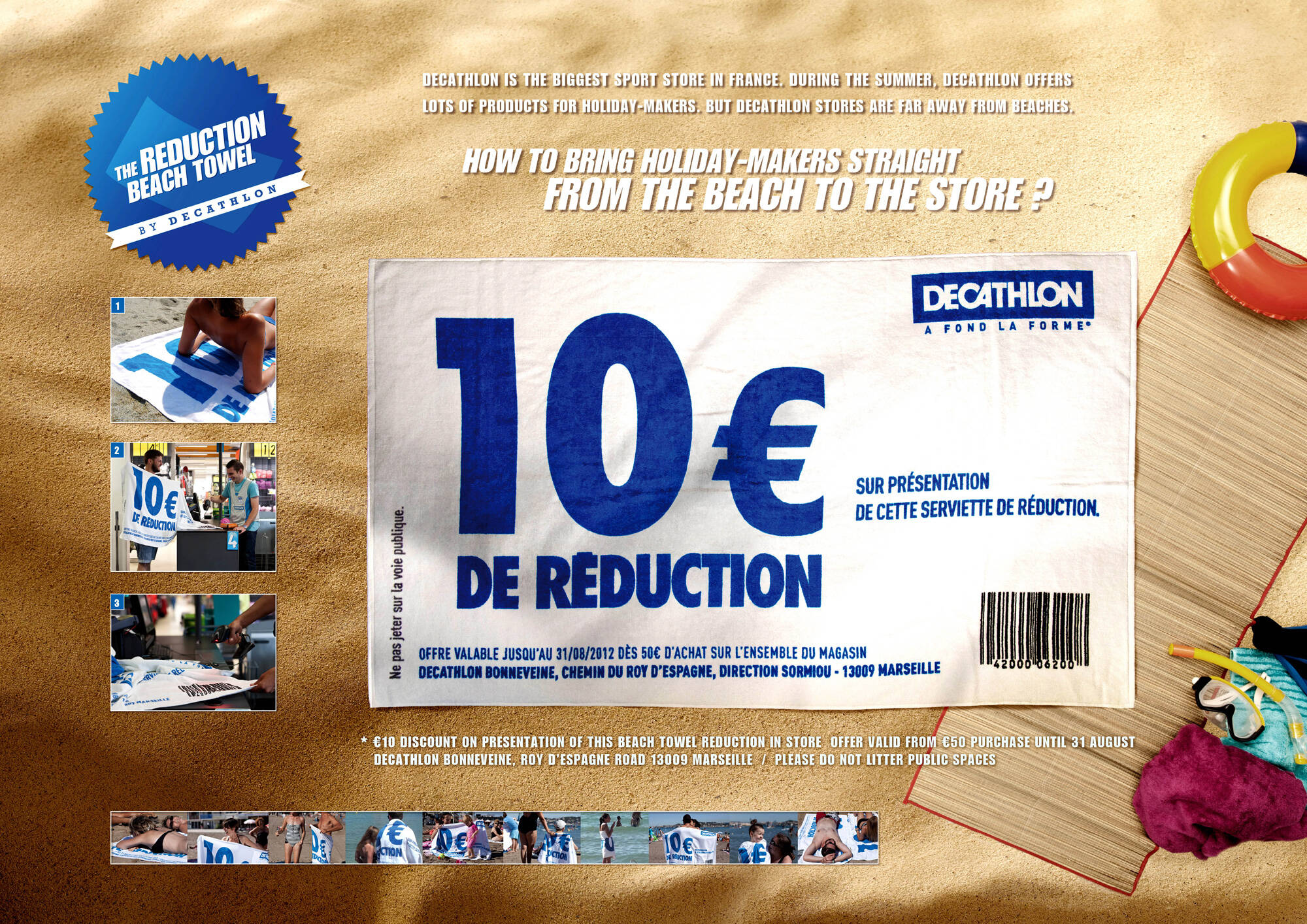 This professional campaign titled 'The Reduction Beach Towel' was published in France in August, 2012. It was created for the brand: Decathlon, by ad agency: BETC. This Ambient medium campaign is related to the Retail Services industry and contains 1 media asset. It was submitted almost 13 years ago.