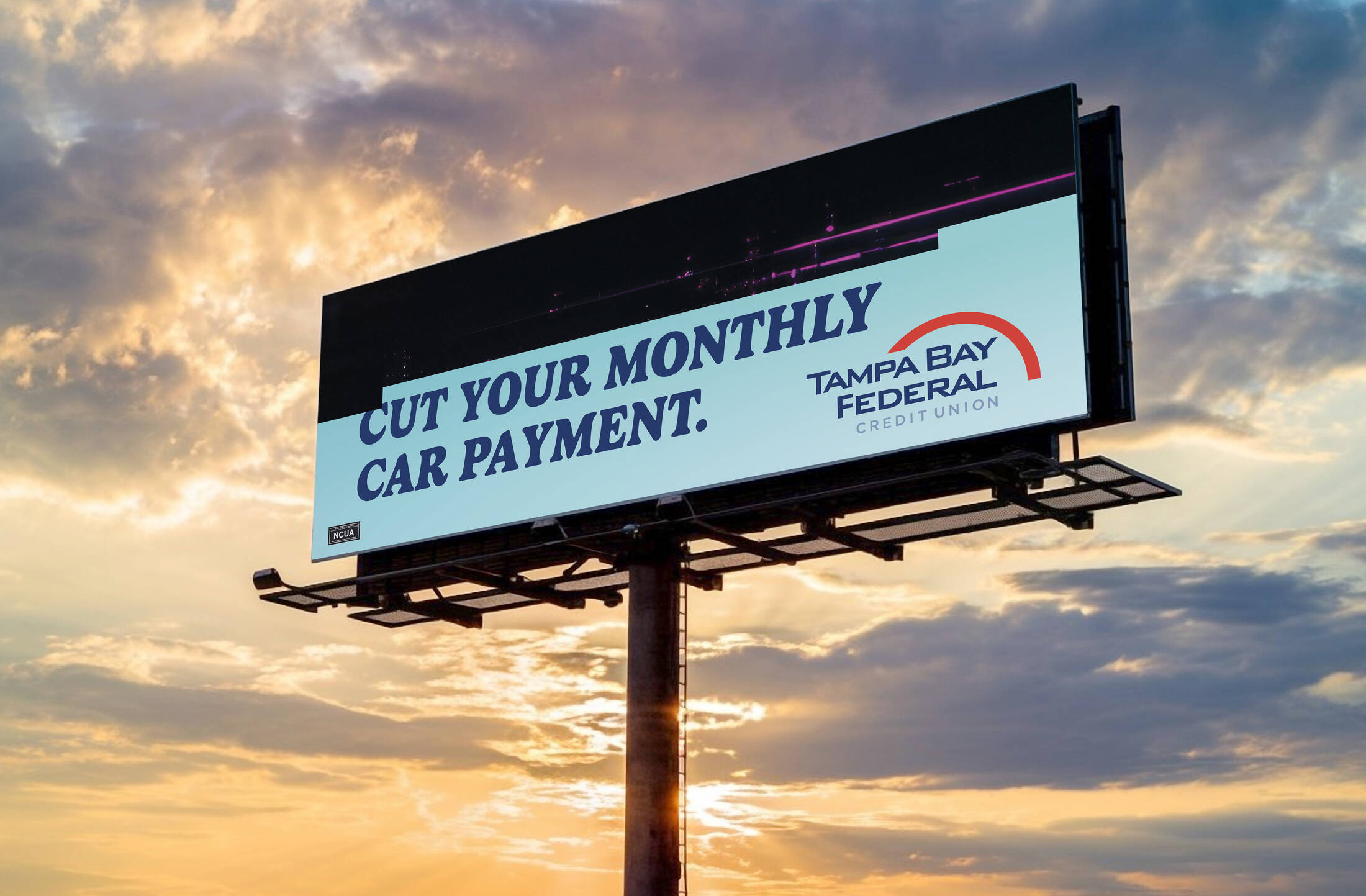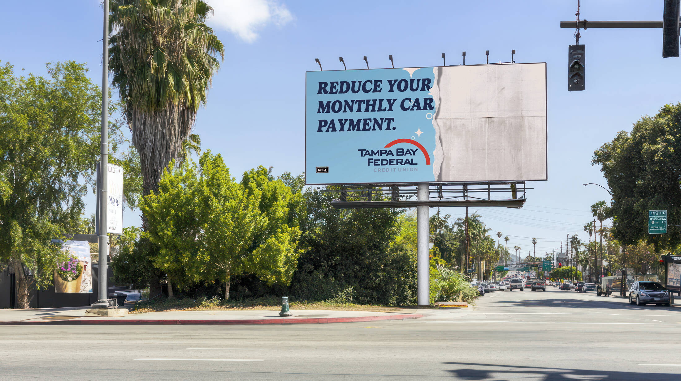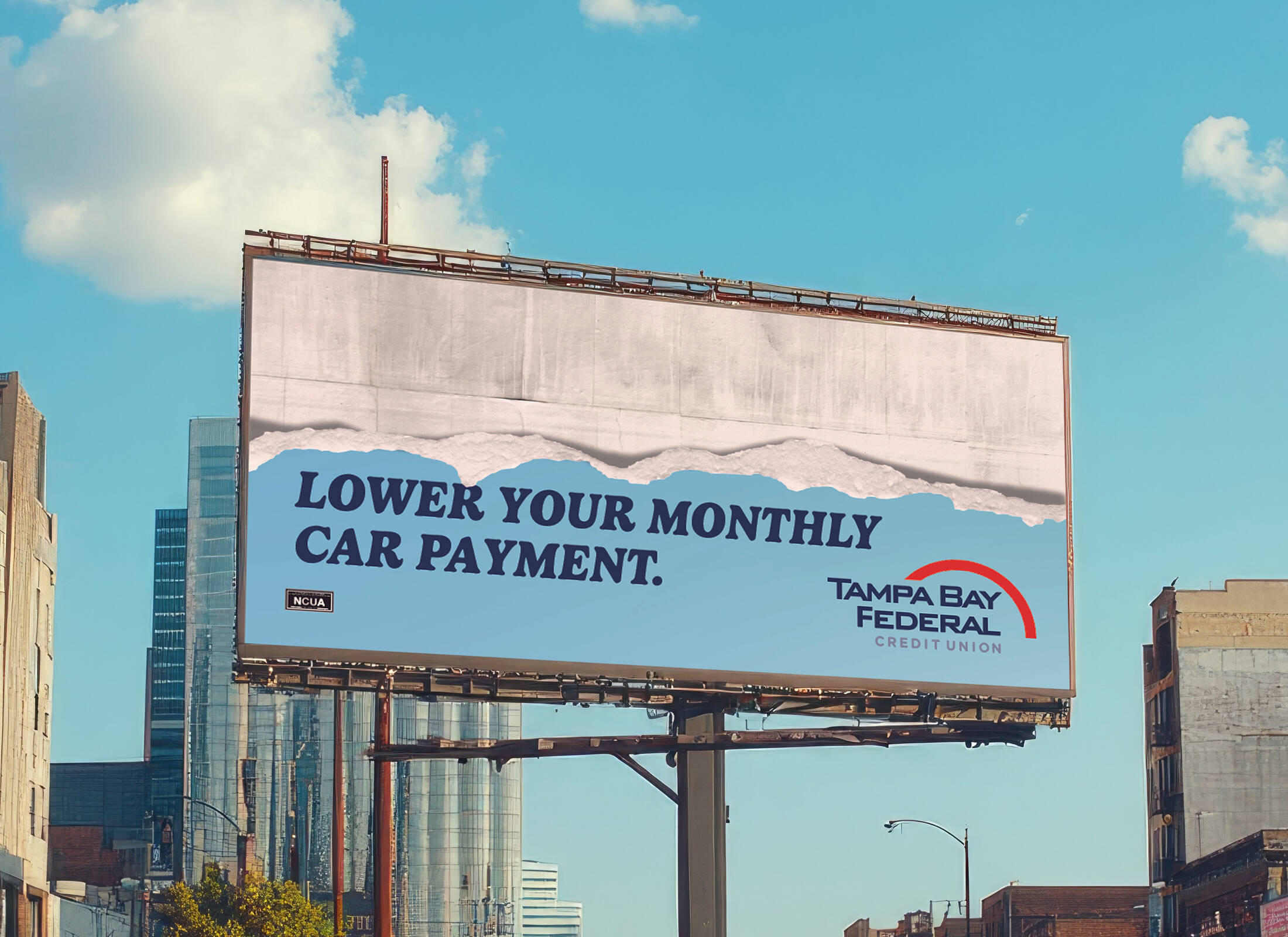 In the static boards, the design employs a torn edge that serves as a powerful, immediate visual metaphor for "lowering" or "cutting" cost. By effectively removing a segment of the visual space, only the clean, essential message remains on the bottom, instantly communicating that Tampa Bay Federal Credit Union is removing a financial burden— high monthly car payments. The implied action of tearing away makes the benefit feel tangible and immediate, reinforced by concise messaging.