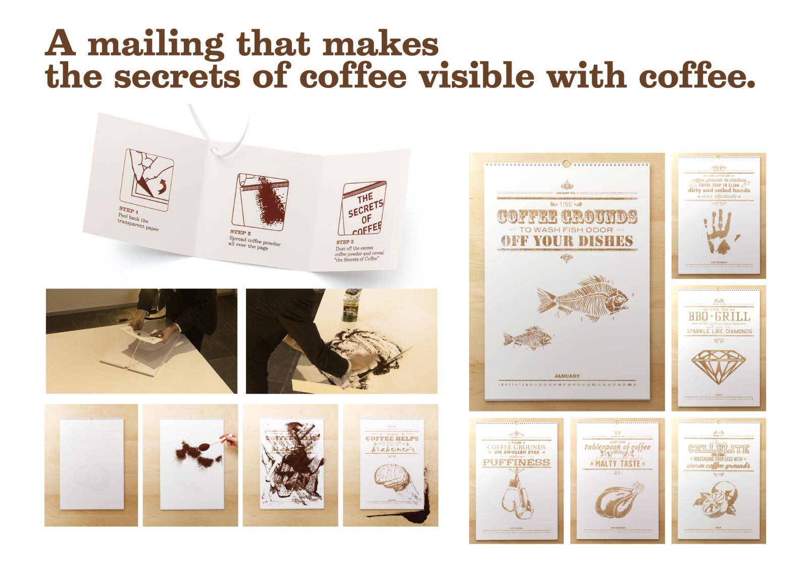 Coffee reveals coffee secrets. The coffee calendar was a VIP mailing of the Kraft Foods Europe Coffee Category for internal and external stakeholders. The main goal was to surprise category experts and involve them. A strange Mailing: a white box with a seemingly blank calendar. The content becomes visible only after coffee powder is spread over the pages and sticks to the glue-print. Visuals and copy appear – coffee secrets: strange facts, usages and effects. A random act of kindness well received and sure to hang in offices for a year.